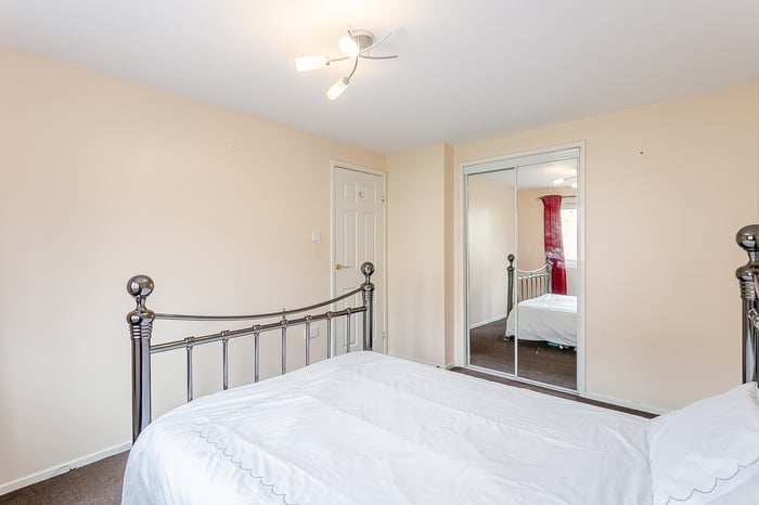 The dining area has two built-in cupboards and glass sliding doors leading directly to the rear garden. Bedroom one is a well-proportioned double with carpeted flooring and a fitted wardrobe with mirrored sliding doors, offering both storage and convenience.