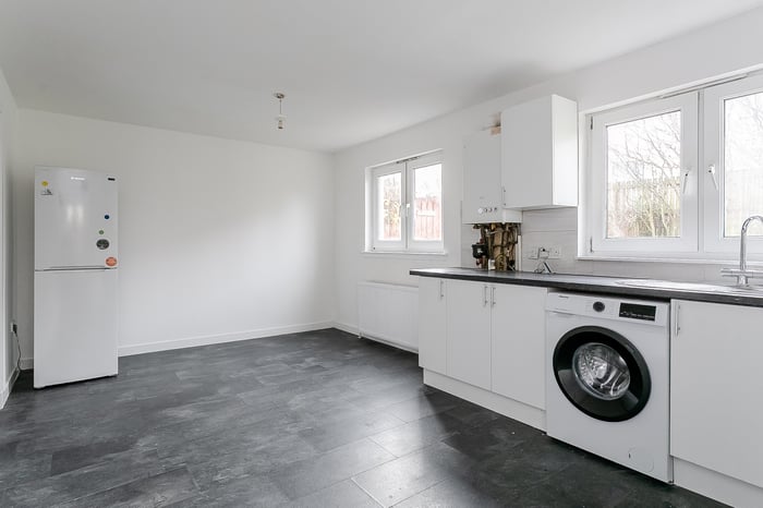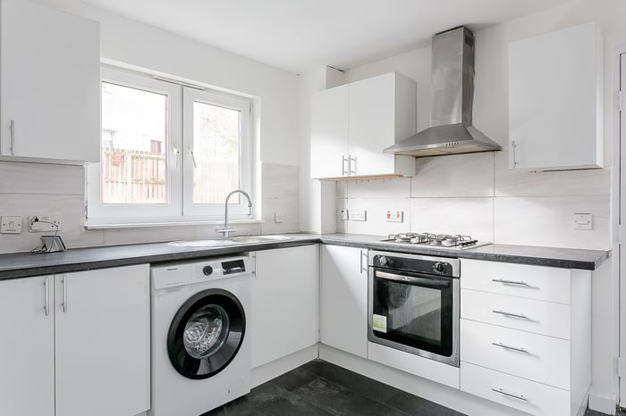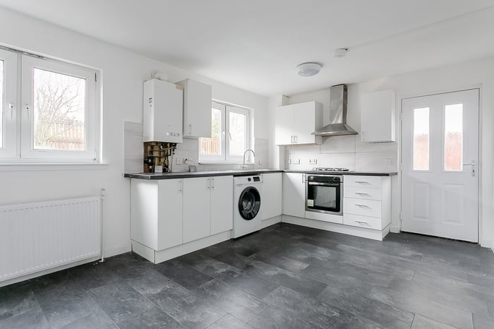 To the rear, a generous kitchen with ample space for dining can be accessed from both the lounge and the hall. Modern fitted units include stone-effect worktops, a sink with a drainer, an integrated hob and oven, and a freestanding washing machine and fridge/freezer.