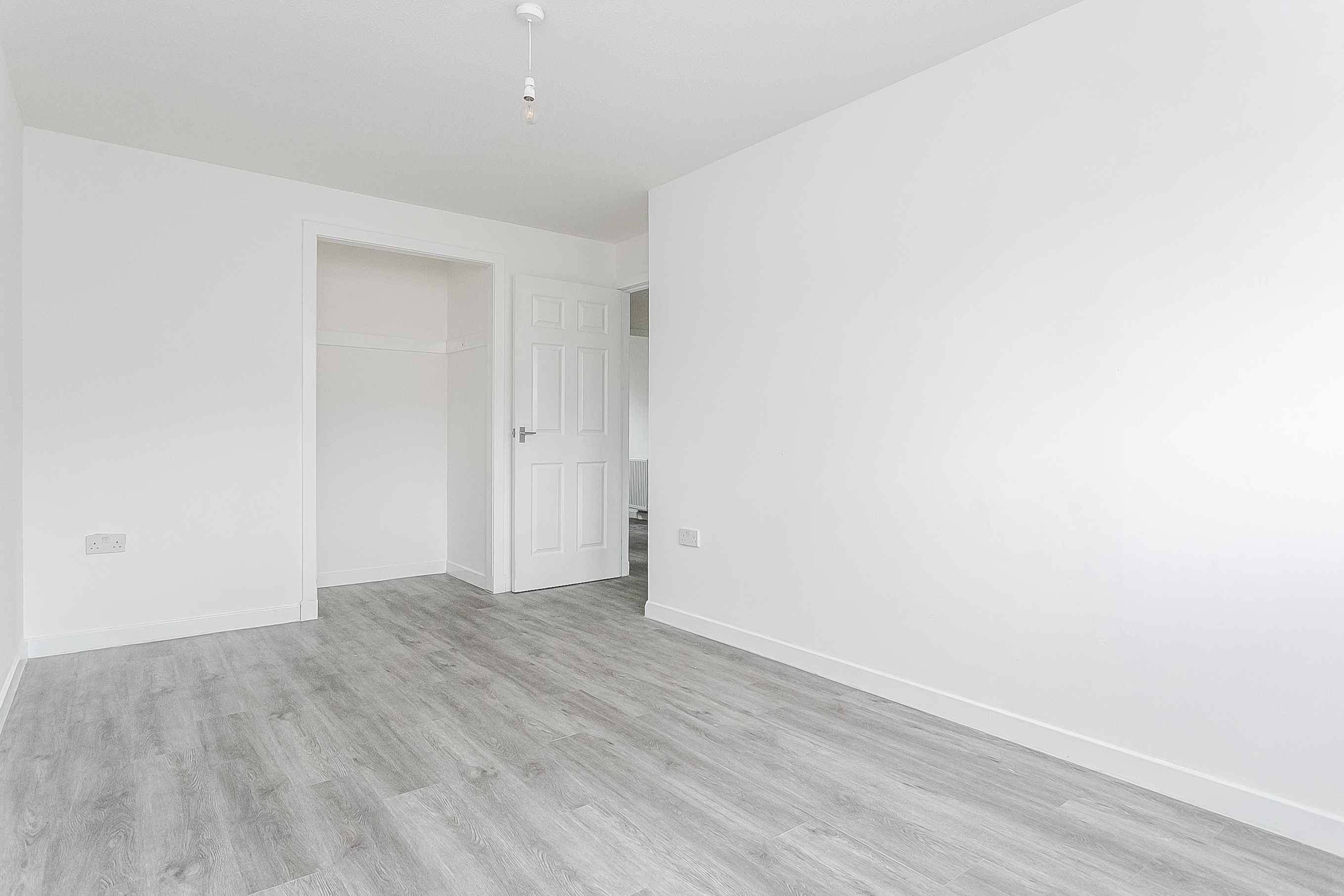 Patio doors open directly onto the rear garden, creating an ideal setting for family meals and entertaining. Upstairs, the property offers three well-proportioned bedrooms, each finished in light, neutral décor with matching wood-effect flooring and recessed storage space.