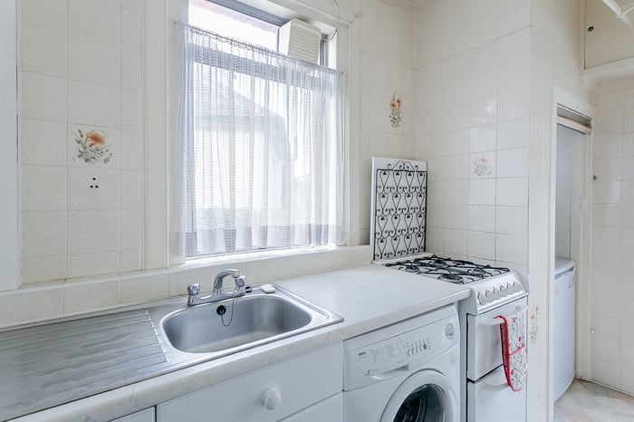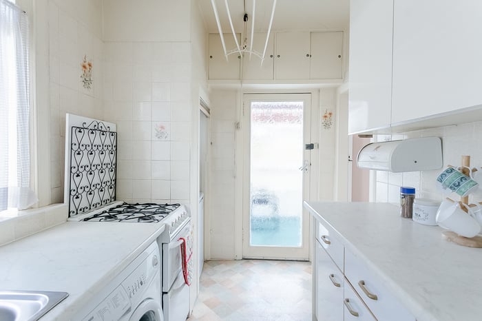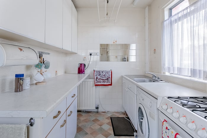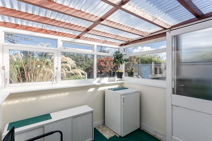 It includes a sink with a drainer, a washing machine, a fridge, a freezer, and a cooker with a gas hob, offering everything needed for modern-day convenience. The sunroom, located just off the kitchen, provides a bright and versatile space that can be enjoyed year-round.