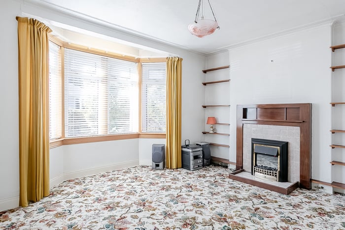 The welcoming vestibule provides access to all rooms within this thoughtfully designed bungalow, which benefits from generous storage throughout. The spacious living room is a standout feature, with soft carpeted flooring, a central light fitting, and a large picture window that floods the space with natural light.