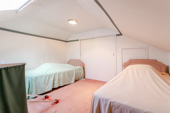 Currently set up as a bedroom, it includes a skylight window that brings in natural daylight, carpeted flooring, and a built-in storage cupboard with attractive wooden sliding doors.