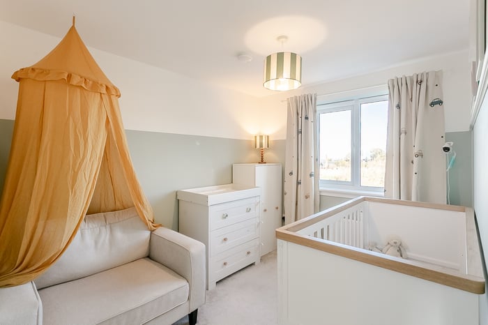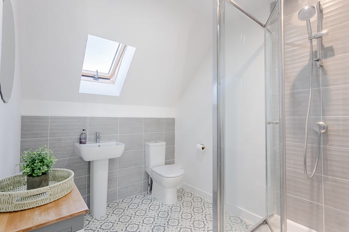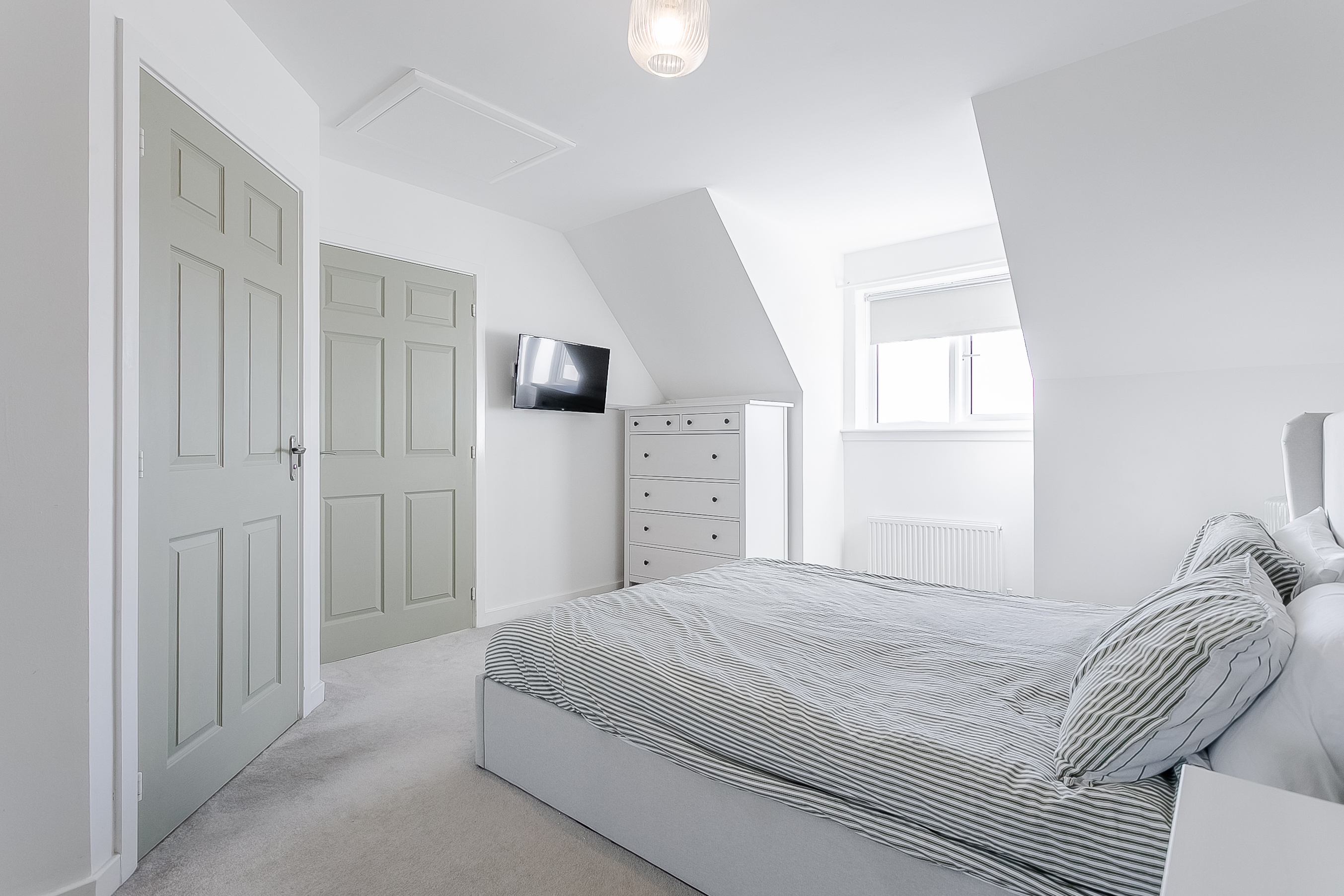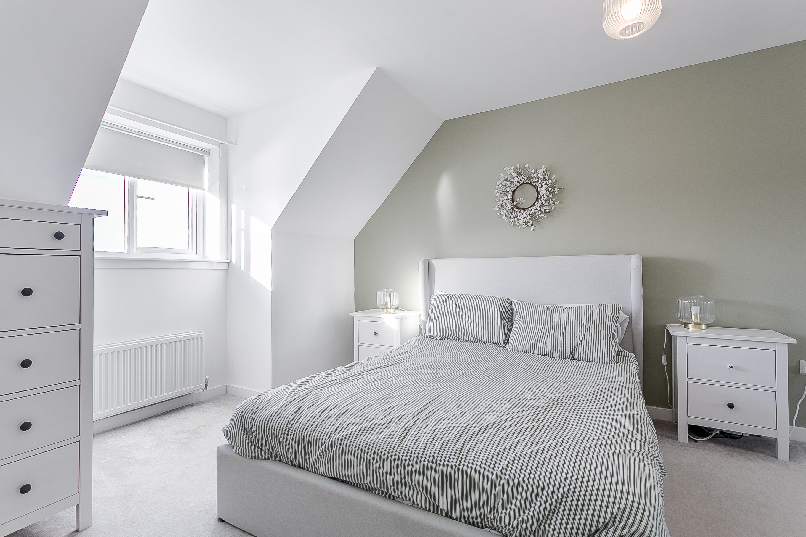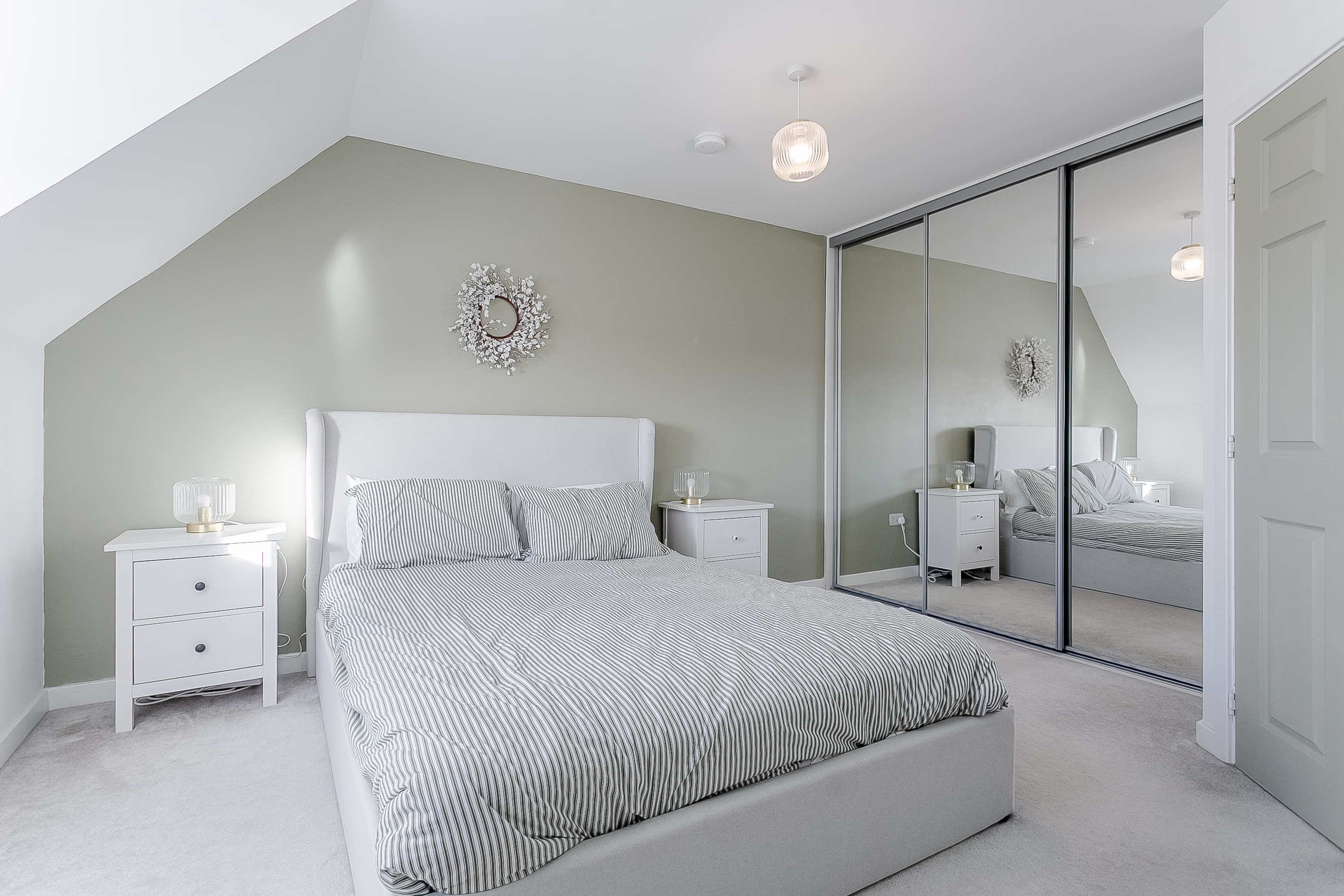 The master bedroom occupies the second floor and serves as a private retreat. It benefits from a built-in wardrobe with mirrored sliding doors and a stylish en-suite shower room.