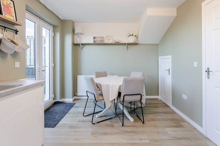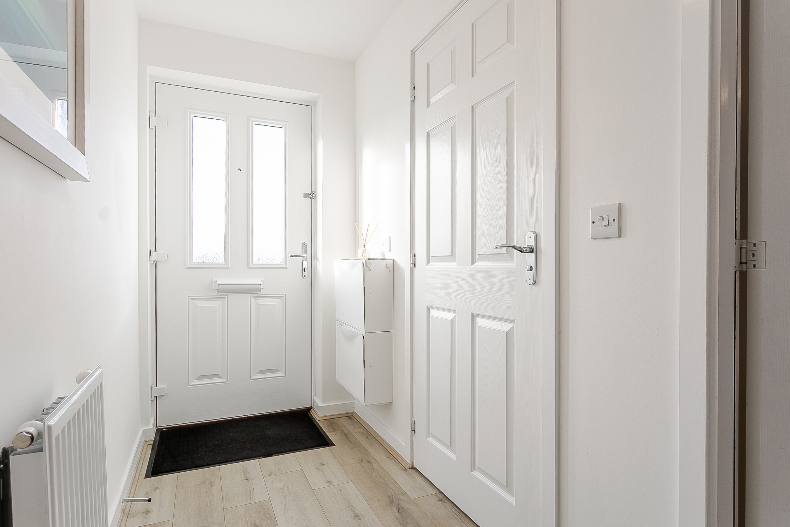 A welcoming entrance hall leads to all ground-floor rooms, setting the tone for this beautifully presented home. The spacious living room offers a bright and inviting atmosphere, enhanced by wood-effect flooring and elegant neutral décor.