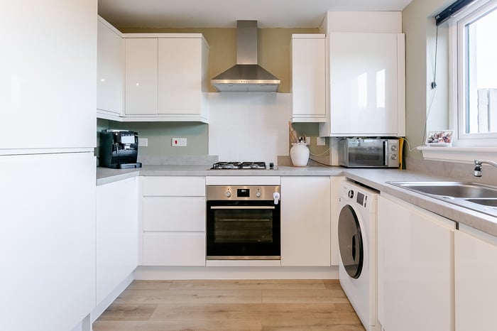 A built-in storage cupboard adds convenience, and integrated appliances include a fridge/freezer, dishwasher, oven, and gas hob with a canopy extractor above. A ground-floor WC provides further practicality for family life or when hosting guests.