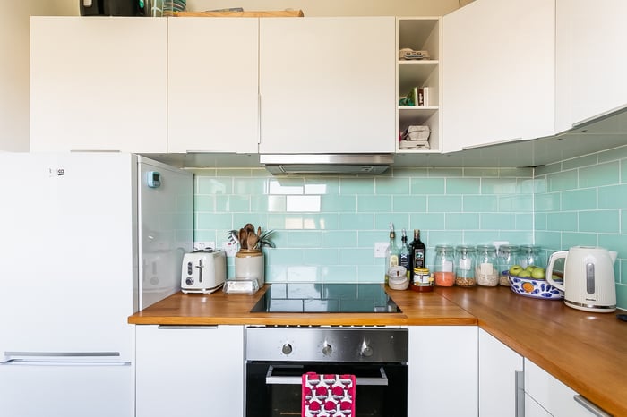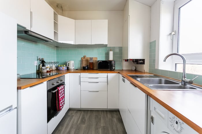 Additional features include a shelved press, simple coving, and two light fittings, creating a comfortable and versatile living space. Just off the living room, a contemporary kitchen is fitted with modern units, solid wood worktops, and a stylish metro-tiled splashback.