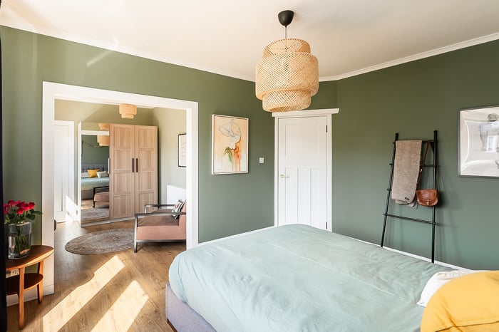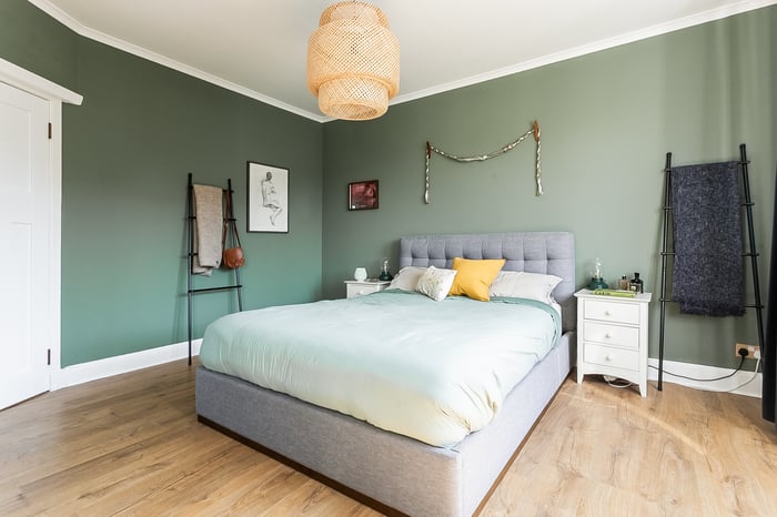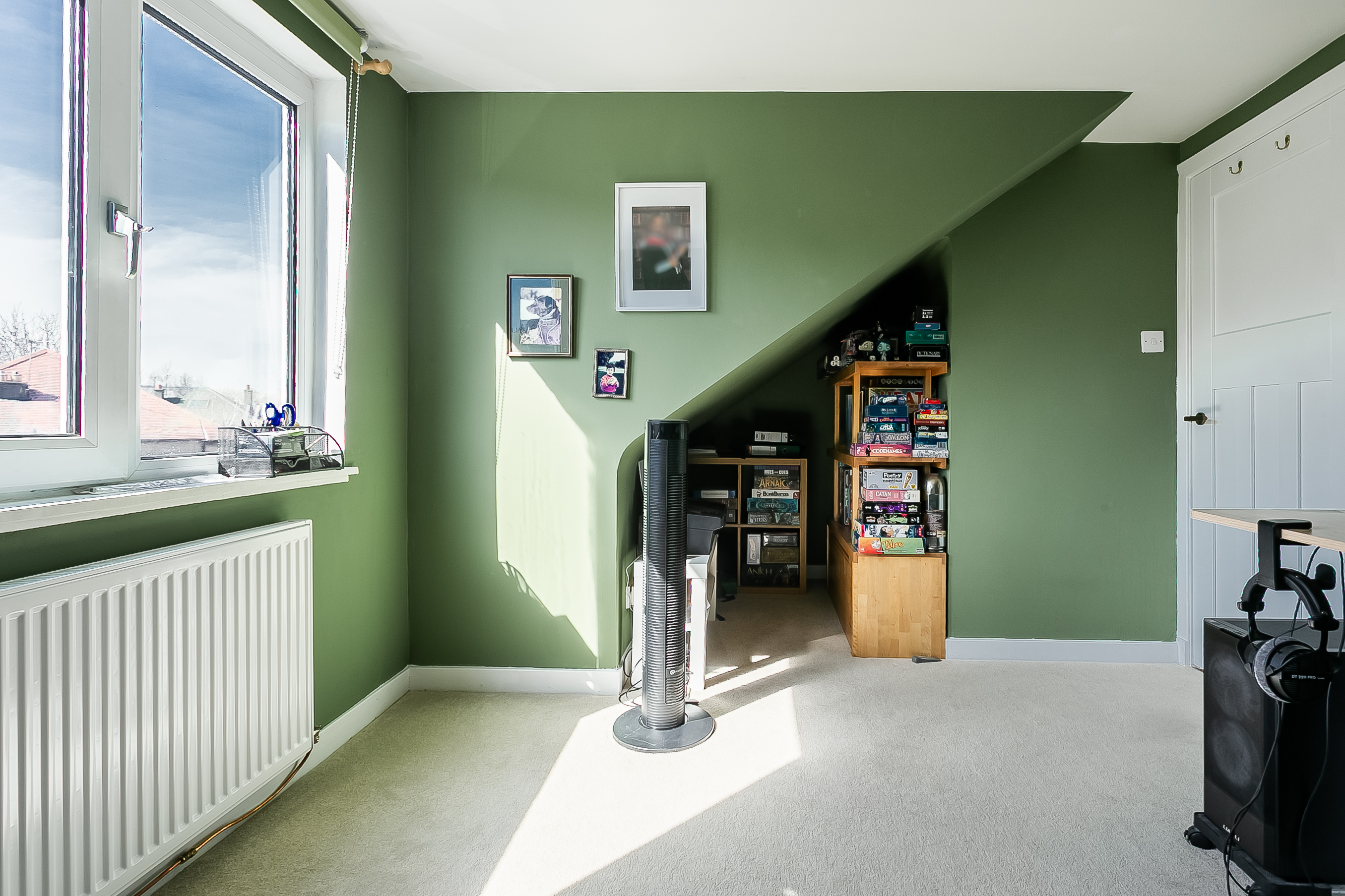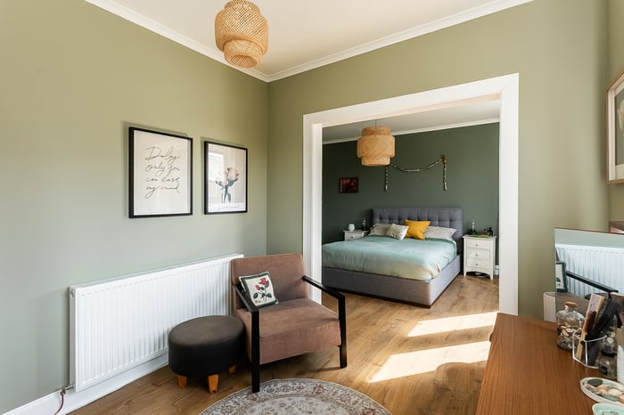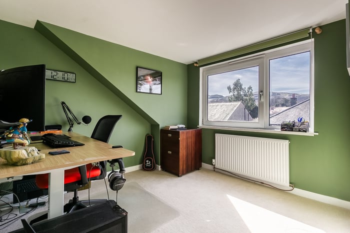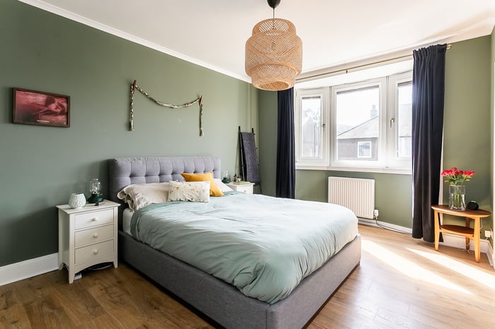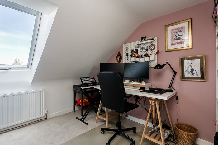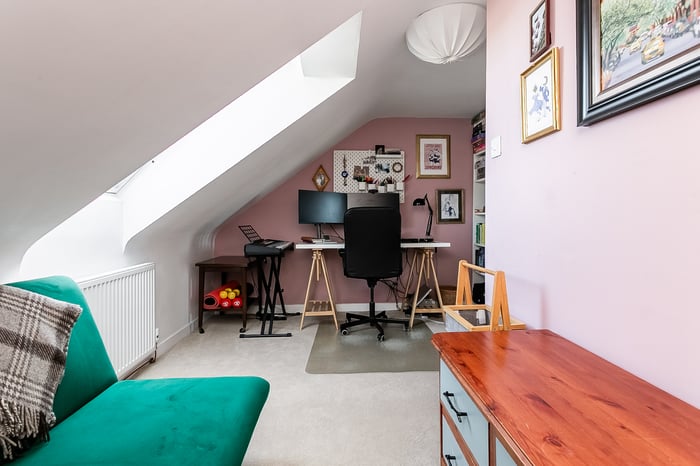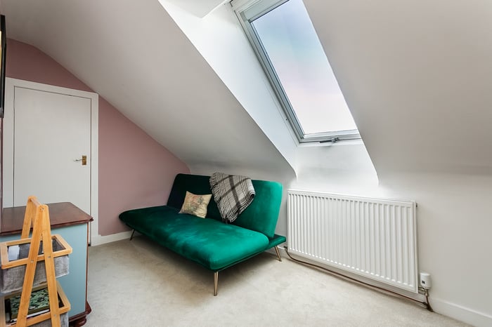 Positioned to the front, the impressive principal bedroom is exceptionally spacious and beautifully presented, featuring a charming bay-style window, built-in storage, generous room for freestanding furniture, including a dressing area, and matching wood-effect flooring. Completing the accommodation, the second floor hosts a built-in cupboard and two further well-proportioned bedrooms, both tastefully decorated and finished with comfortable carpeted flooring, offering flexible accommodation ideal for family living, guests, or home working.