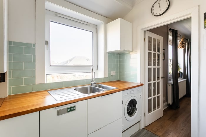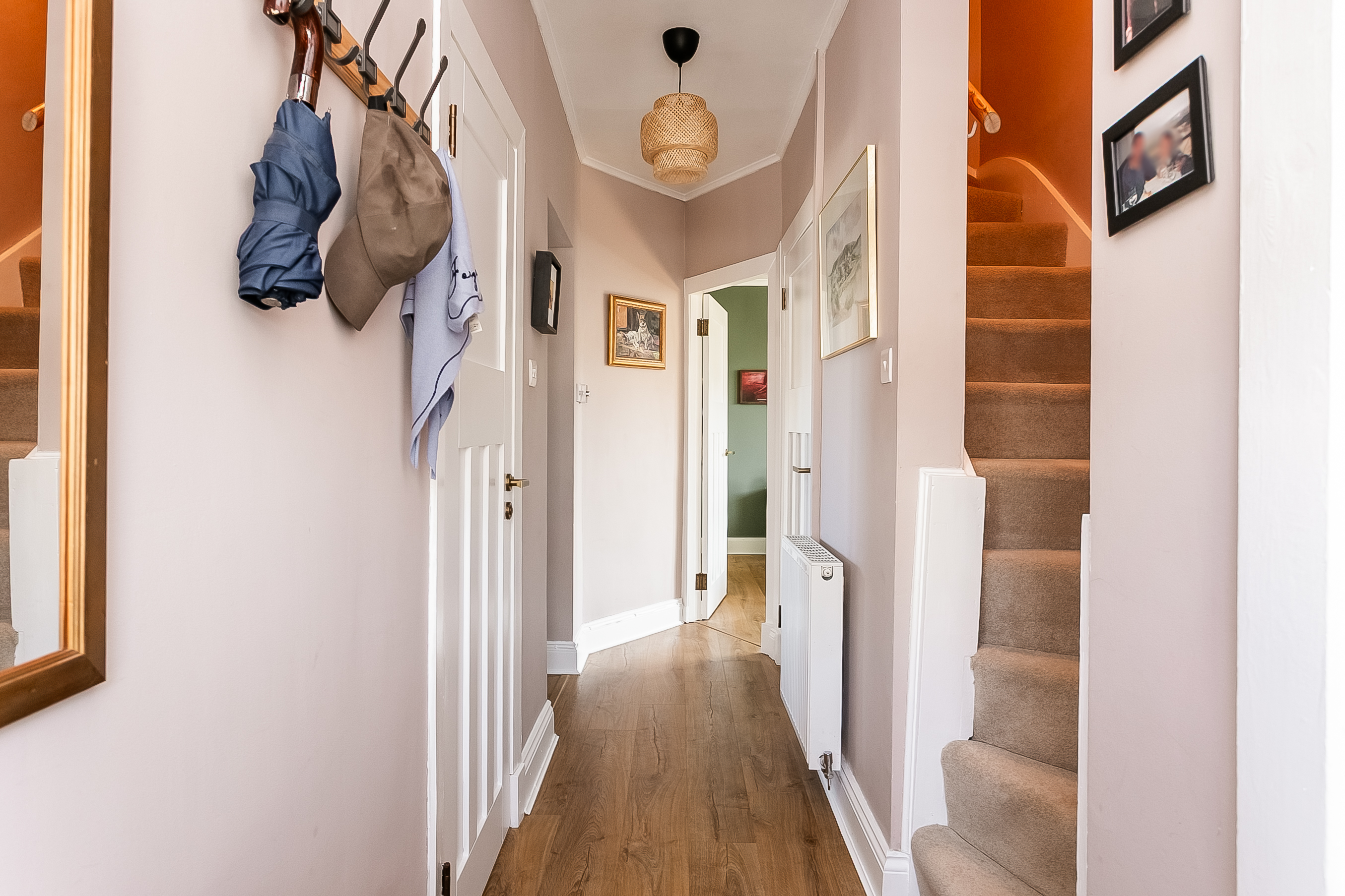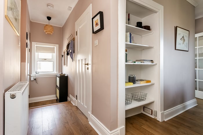 Immaculately presented, this three-bedroom traditional double-upper villa offers stylish interiors, private gardens, a driveway, and delightful views towards the Pentland Hills. Set on a peaceful side street in the popular Colinton Mains area, to the south-west of the city centre, the property provides a perfect balance of tranquillity and convenience. A welcoming entrance leads to a staircase rising to the main hall, which gives access to the majority of the first-floor accommodation, including a convenient storage cupboard. To the rear, a generously proportioned living room features attractive wood-effect flooring flowing through from the hall, along with ample space for both lounge and dining furniture.