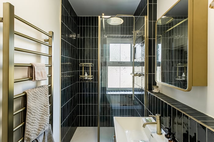 Appliances include an induction hob, oven, dishwasher, washing machine, and fridge/freezer. Also on the first floor, a luxurious shower room is finished to a high standard, complete with a large cubicle and rainfall shower, complemented by stylish tiled splash walls and a ladder-style radiator.