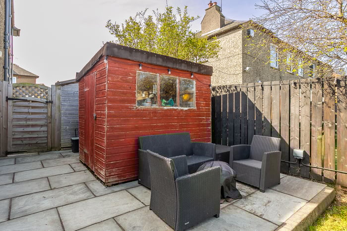 • Externally, the property boasts a private driveway and a store shed to the front, whilst a generous L-shaped plot to the rear includes a lawn and a second store shed.