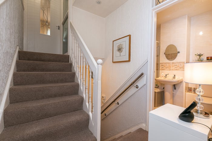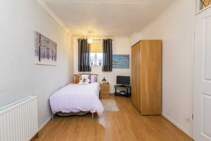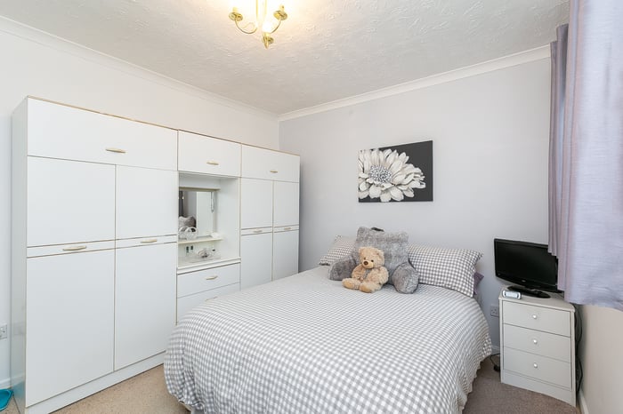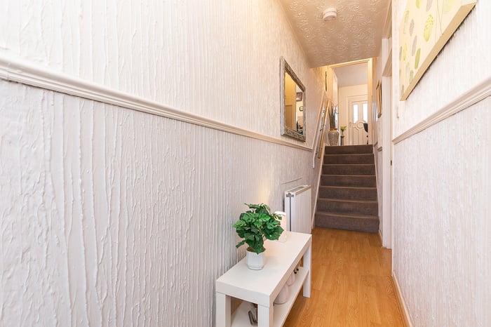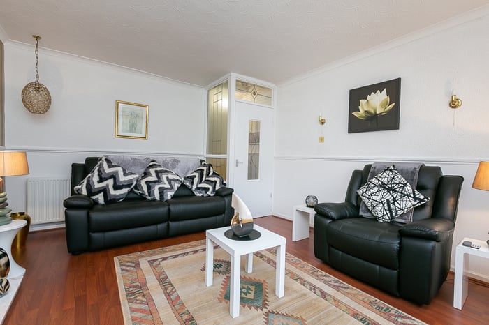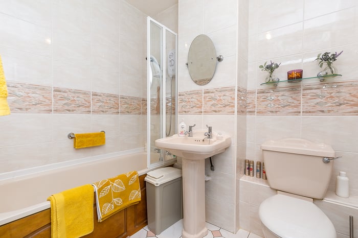 Both are finished with light, neutral decor and, whilst bedroom one is carpeted, bedroom two is fitted with wood-effect flooring, an integrated wardrobe and understairs, cupboard storage. Completing the accommodation, a good-sized bathroom comprises a three-piece suite, a shower-over-bath and tiled splash walls.