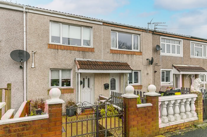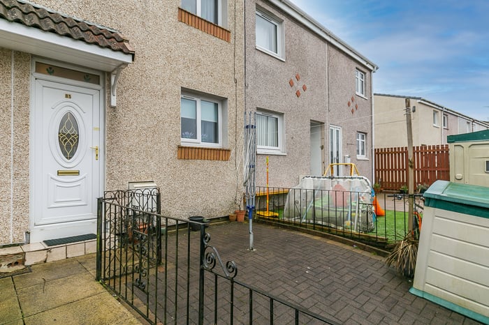 Beautifully presented, two-bedroom, mid-terrace house, with front and rear gardens. Located in a quiet and established residential area of Craigend, northeast of Glasgow city centre. Enjoying elevated, top-floor views from a wide, southeast-facing window, a living room is fitted with modern, wood-effect flooring and a traditional fireplace, and offers generous space for freestanding items of furniture.