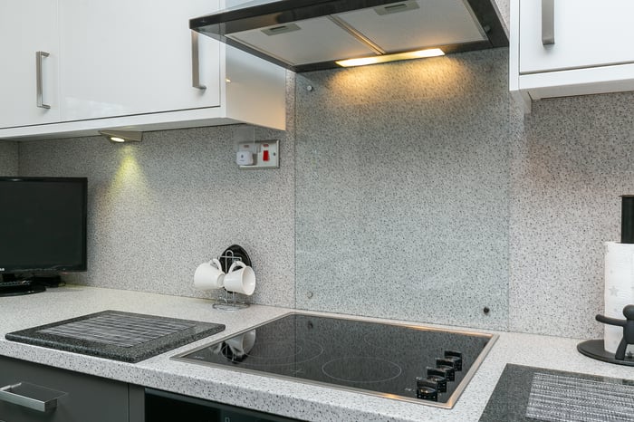 Set to the same sunny aspect, with external access and space for seated dining, a kitchen is fitted with stylish, contemporary units, granite-effect worktops and matching upstand, a stainless-steel sink with a drainer, an integrated oven, an electric hob and a canopy. Set to the opposite aspect are two spacious, tastefully presented bedrooms.