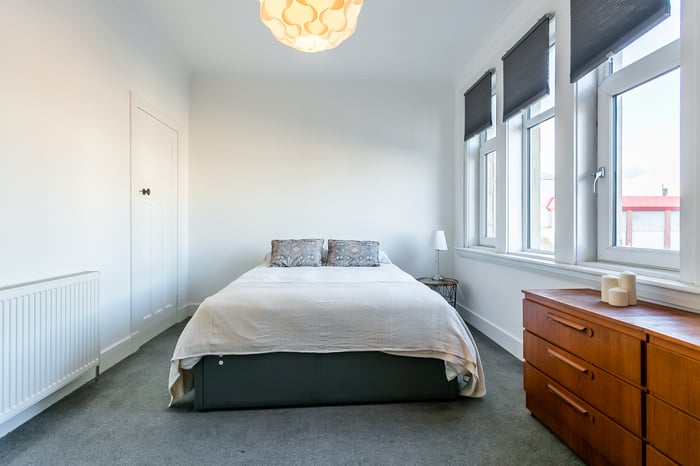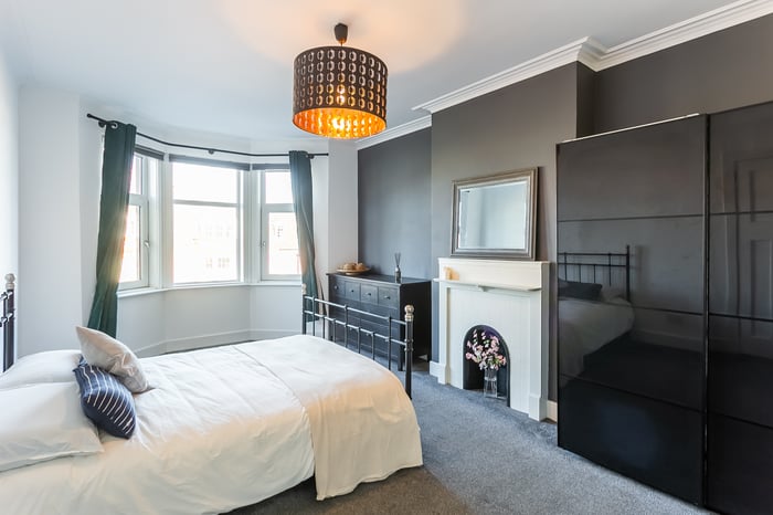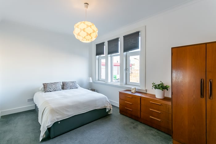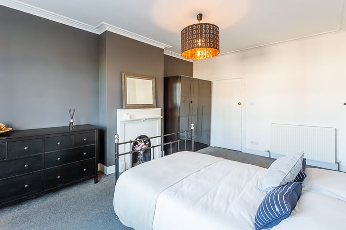 Set to the front, an exceptionally spacious, tastefully finished, master bedroom features a bay window allowing plentiful natural light, a feature fireplace, carpeted flooring, ample space for freestanding storage and a generous en-suite shower room. A further well-finished and generous bedroom also has a front-facing aspect, and features carpeted flooring and a built-in store cupboard.