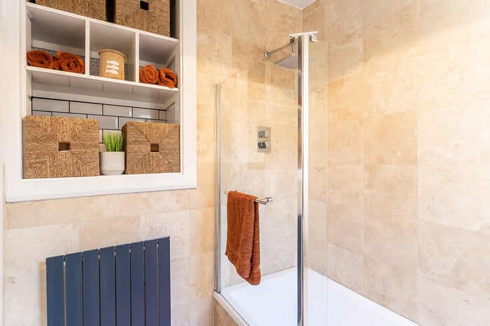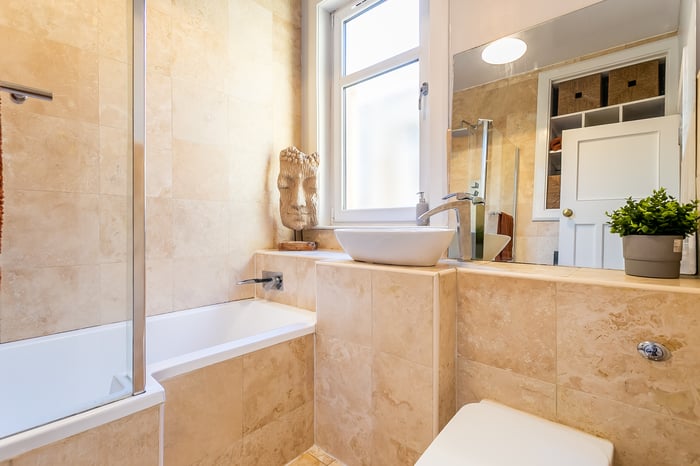 Completing the accommodation, the bathroom has a side aspect window and is fitted with a contemporary suite, including a main shower over a P-shaped bath, and Travertine tiled splash walls and flooring.