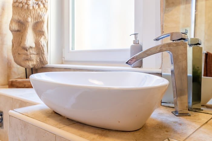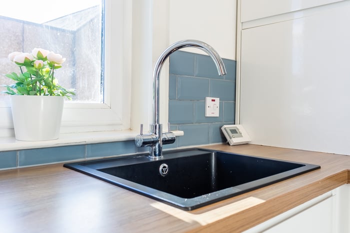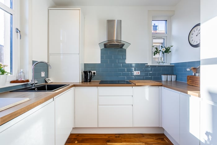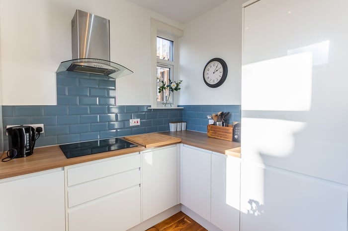 Open to the lounge, a stylish, dual-aspect kitchen is fitted with modern units, wood-effect worktops, a tiled surround, spotlighting, a sink; and an integrated fridge/freezer, washing machine, electric oven and ceramic hob. Also set off the lounge is a flexible third bedroom with continuous wood flooring, and offers a potential office or separate dining space.