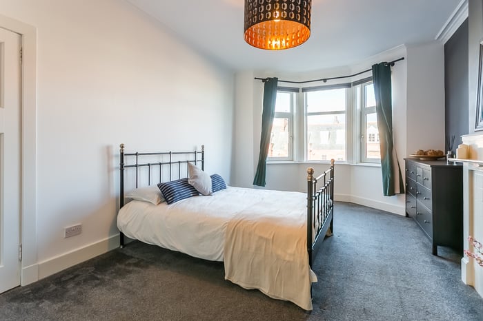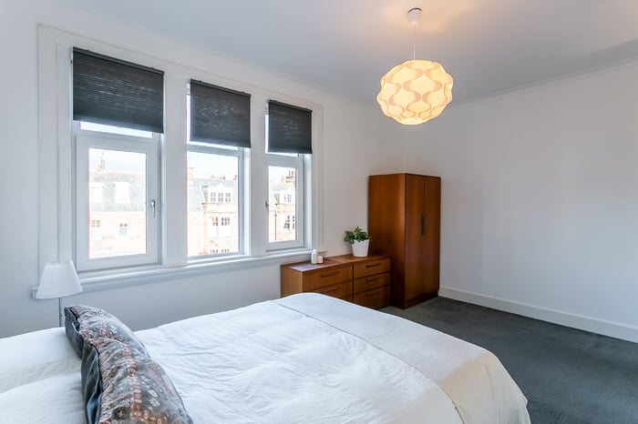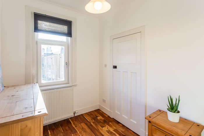 Beautifully presented and spacious, flexible three-bedroom, second (top) floor flat, set within a traditional-style stone-built terrace. Located in the desirable and highly sought-after Comely Bank area, just north of Edinburgh city centre. An impressive reception hall offers space for cloak-wear and freestanding furniture and affords access throughout the majority of the property, including a convenient built-in store cupboard. Solid wood flooring continues from the hall into a south-facing public room, which includes a feature fireplace, a press cupboard, and a central light fitting.