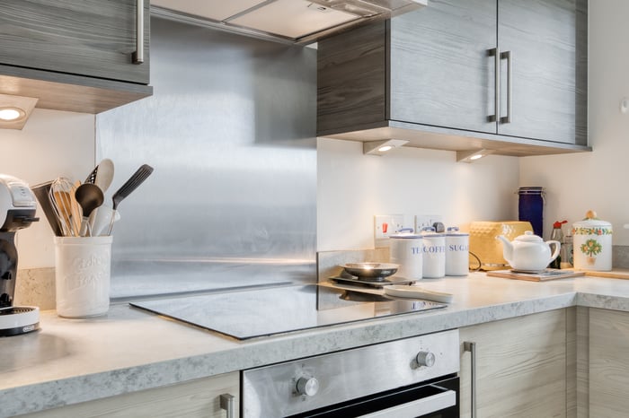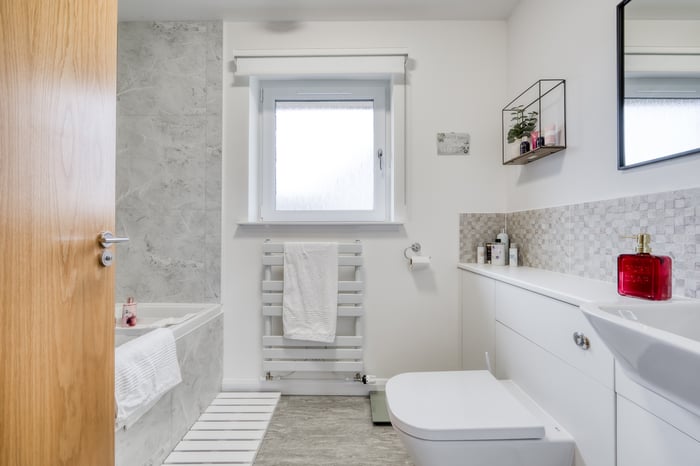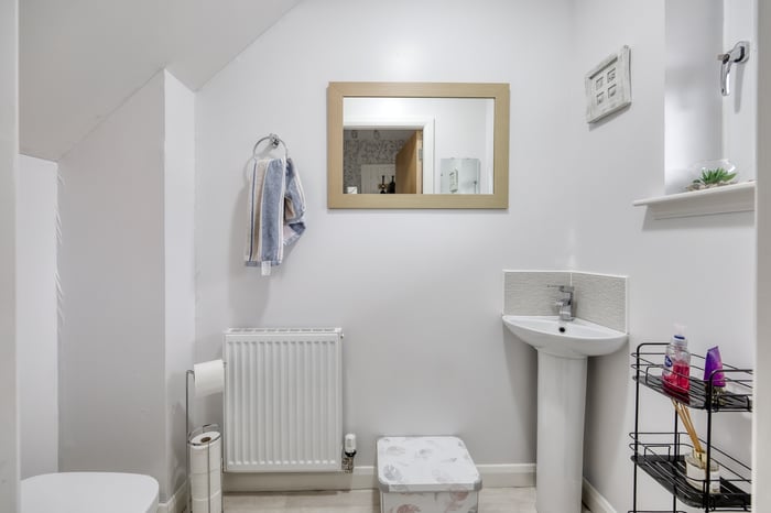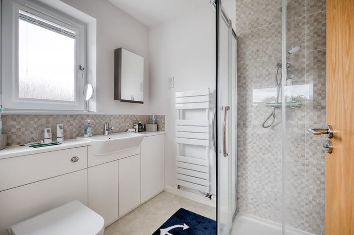 The accommodation is completed by a modern family bathroom fitted with a three-piece suite including a shower over the bath, tiled splash walls, and a ladder-style radiator.