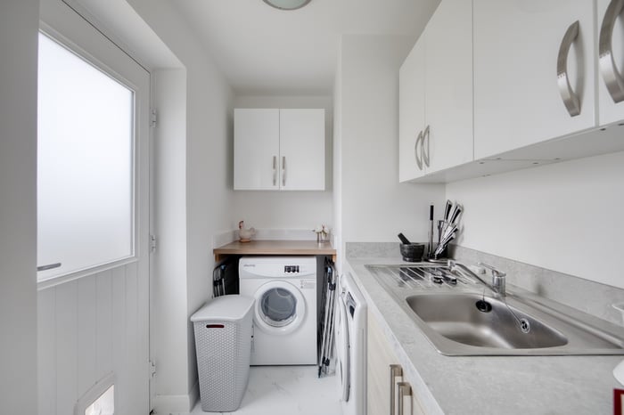Stylishly fitted with contemporary units, stone-effect worktops, a breakfast bar, and a range of integrated appliances – including an electric hob, oven, and fridge/freezer – the space is completed by French doors opening out to the rear garden. A separate utility room offers additional storage, a sink, and space for freestanding appliances, with direct access to the garden.