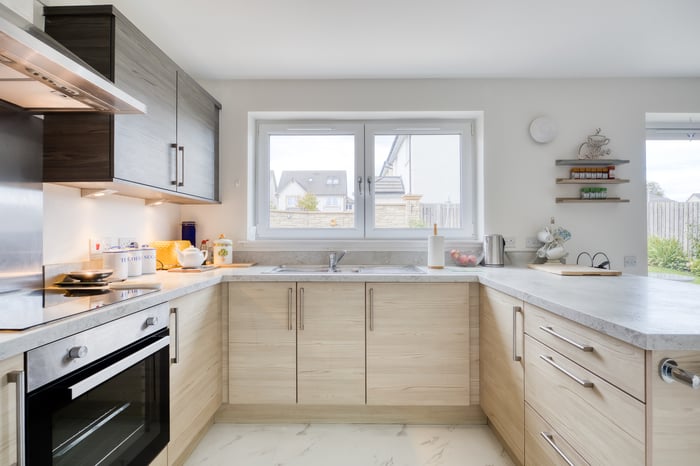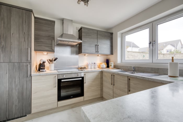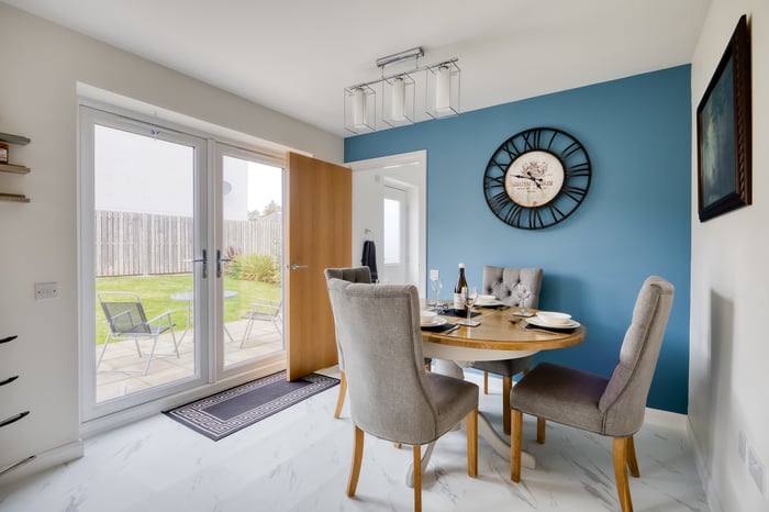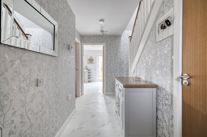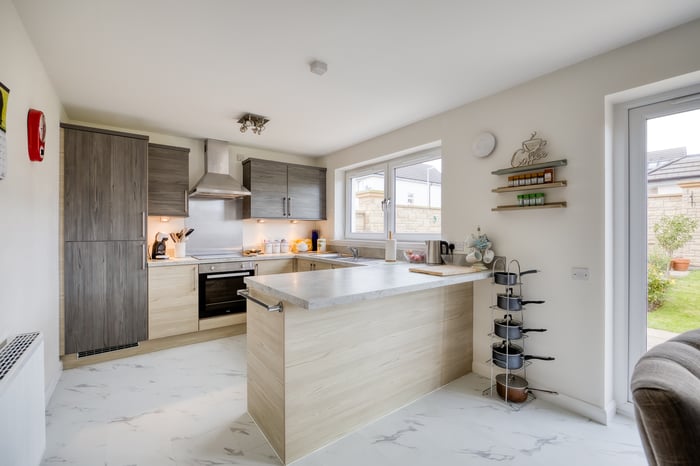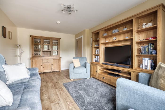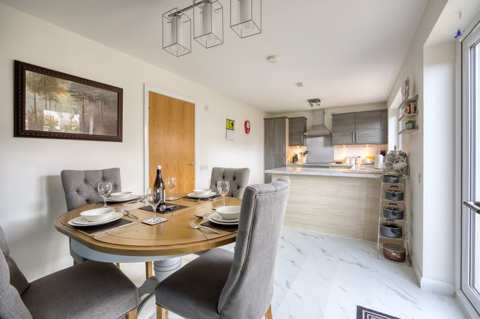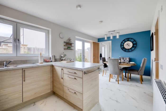 To the front, a bright and airy lounge features twin windows, tasteful neutral décor, and wood-effect flooring, creating a warm and inviting space. To the rear, the generous open-plan kitchen and dining area is perfect for family life and entertaining.