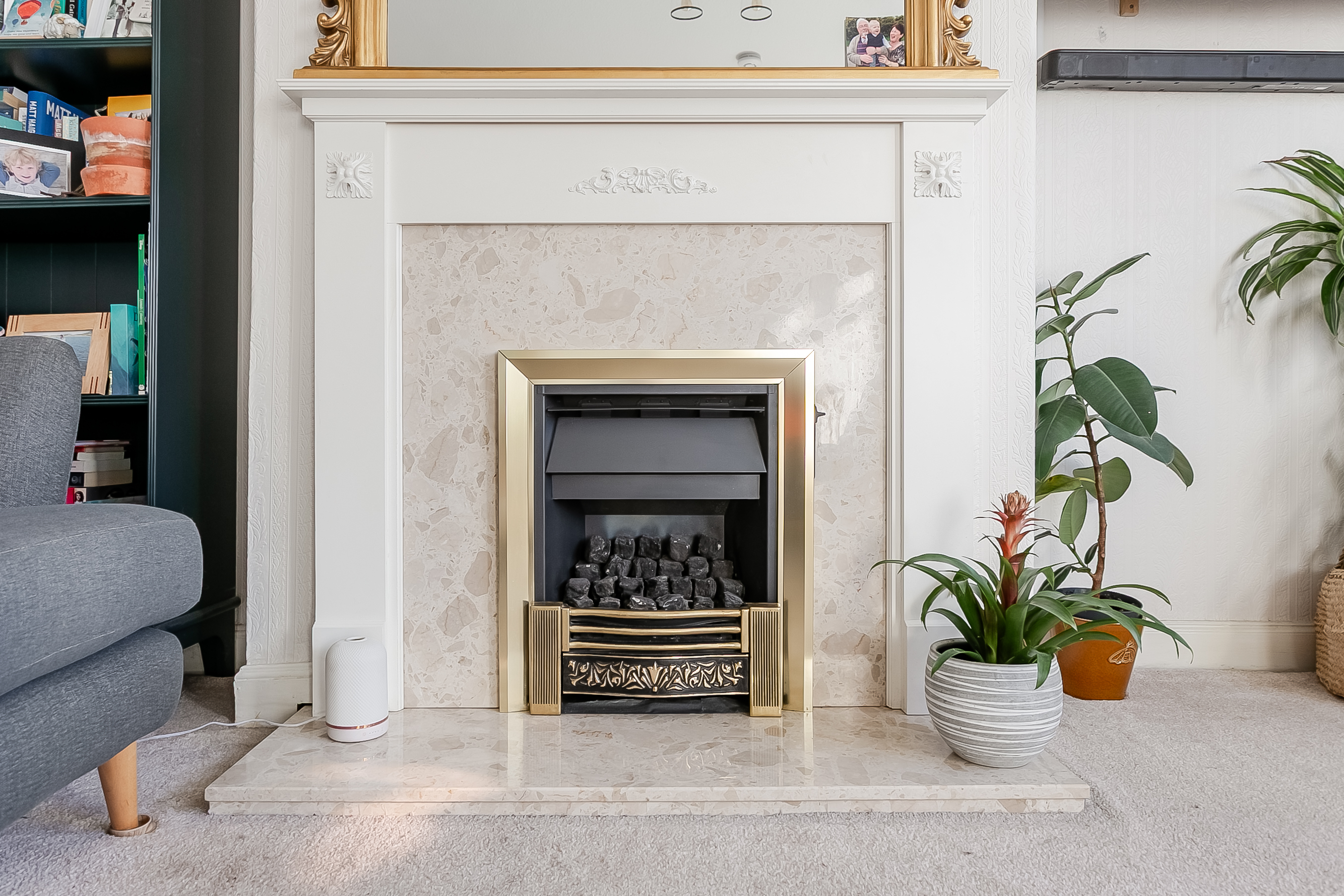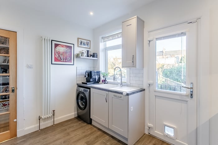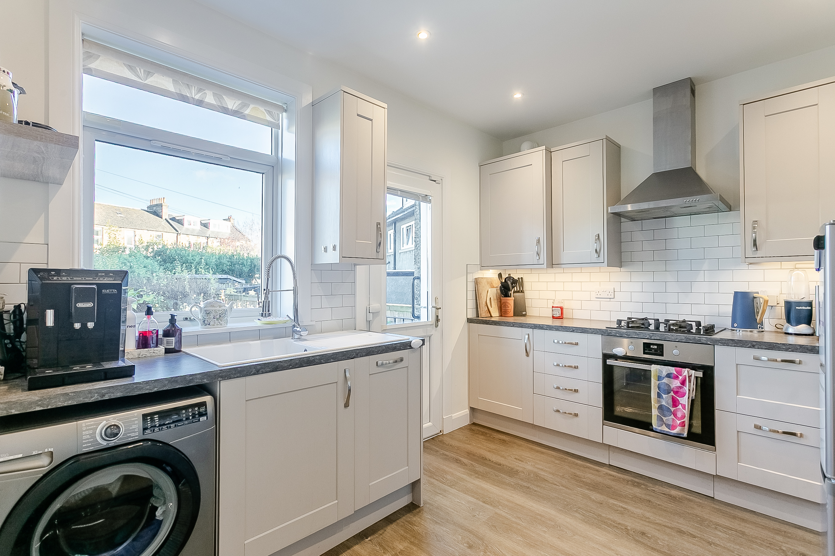 This room benefits from a fireplace and wall-mounted TV point, making it ideal for both relaxing and entertaining. Located at the rear of the property, the kitchen is fitted with contemporary flooring, granite-effect worktops and a tiled splashback, along with a sink and drainer and a range of integrated appliances including an oven, gas hob with canopy and dishwasher, while a freestanding fridge/freezer is also included in the sale.