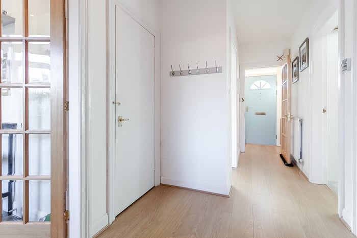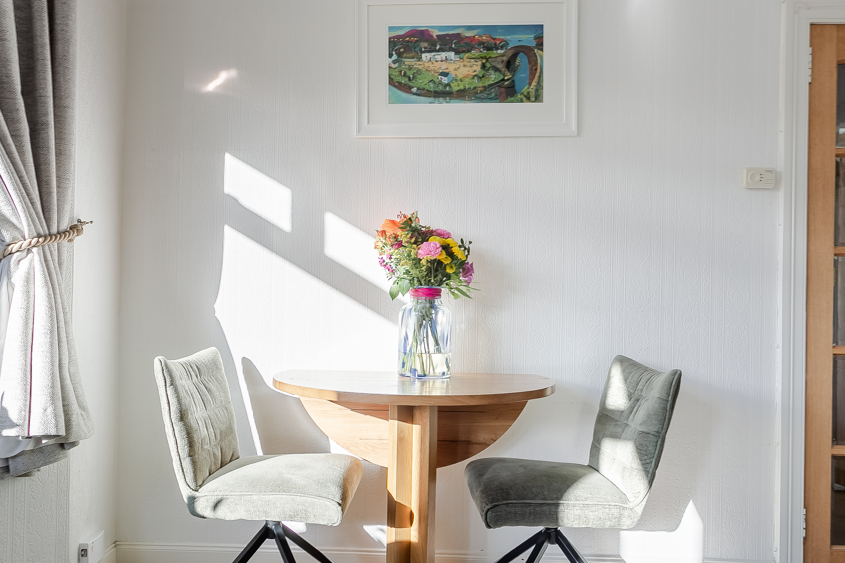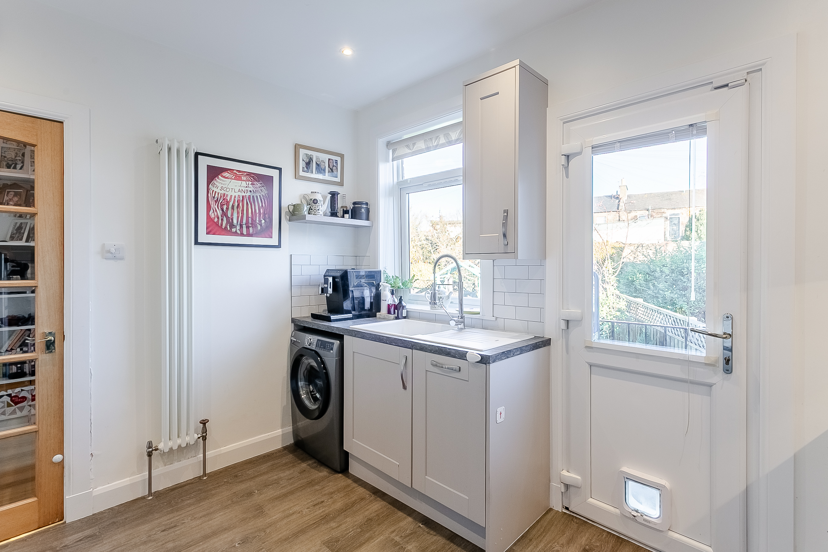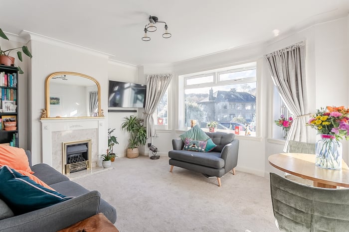 Light and tastefully presented, two-bedroom, traditional ground-floor villa, with private gardens. Located in the highly sought-after area of Davidsons Mains, west of Edinburgh city centre. A welcoming entrance hall provides access to all rooms within the home, with the living room positioned to the side and offering a comfortable, inviting space featuring carpeted flooring and light, neutral décor.