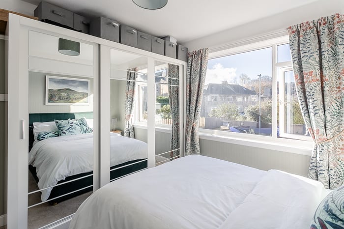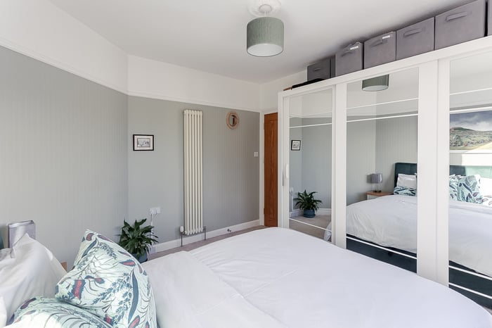 To the front of the home, the master bedroom enjoys carpeted flooring, tasteful décor, while the second bedroom mirrors the same carpeted finish and features a large window allowing plenty of natural light to fill the space. Completing the property is the family bathroom, fitted with a modern three-piece suite with a shower over the bath and finished with a stylish ladder-style radiator.