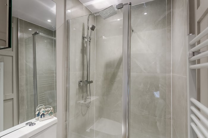 The generously sized double bedroom benefits from soft carpeted flooring, two built-in storage cupboards, and a central ceiling light, offering a comfortable and practical retreat. Completing the property is a contemporary three-piece shower room, finished with a rainfall showerhead, spotlighting, tiled splashback surrounds, wood-effect flooring, and a modern ladder-style radiator, delivering a stylish and functional space.