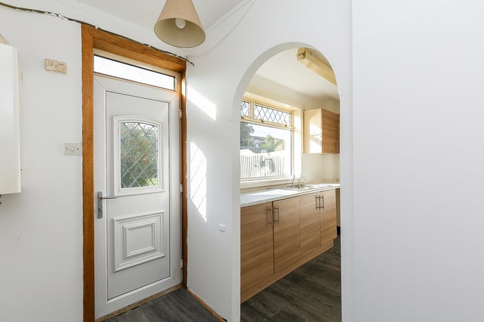 A generous glazed entrance porch offers extensive space for outerwear storage and opens to the hall giving further access throughout the ground floor and to an understairs store cupboard. Front-facing, the living room has a feature fireplace with a tasteful surround, wood-effect flooring and a central light fitting.