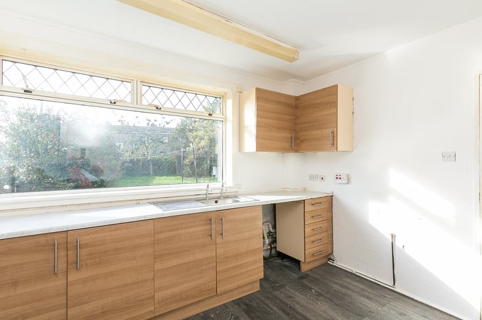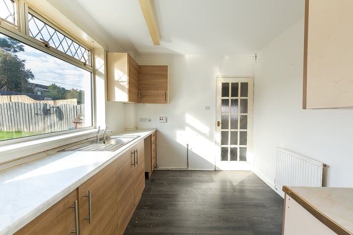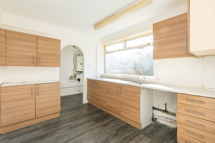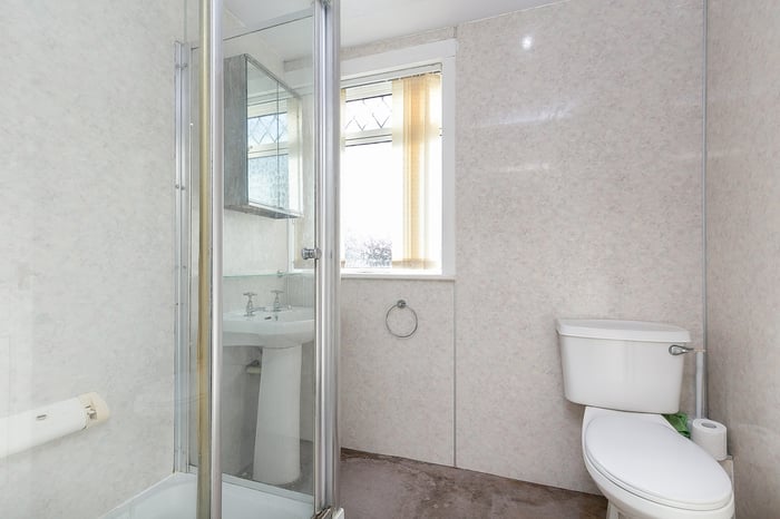Rear-facing, the kitchen can accommodate a breakfast table and has a semi-partitioned utility/store with a door to the garden and the potential to open for a dining/kitchen. Off the hall, a bright shower room is fitted with a modern two-piece suite and a corner cubicle, with contemporary wall-panelling and flooring.