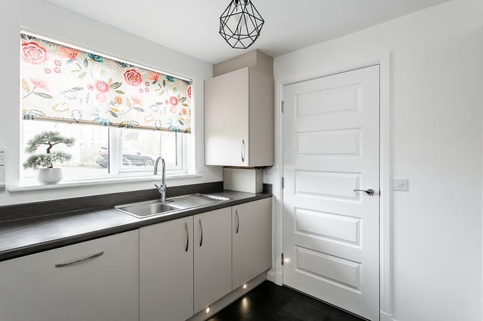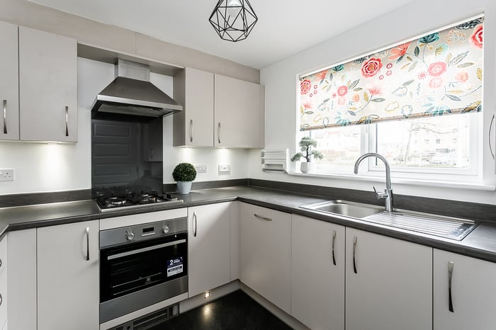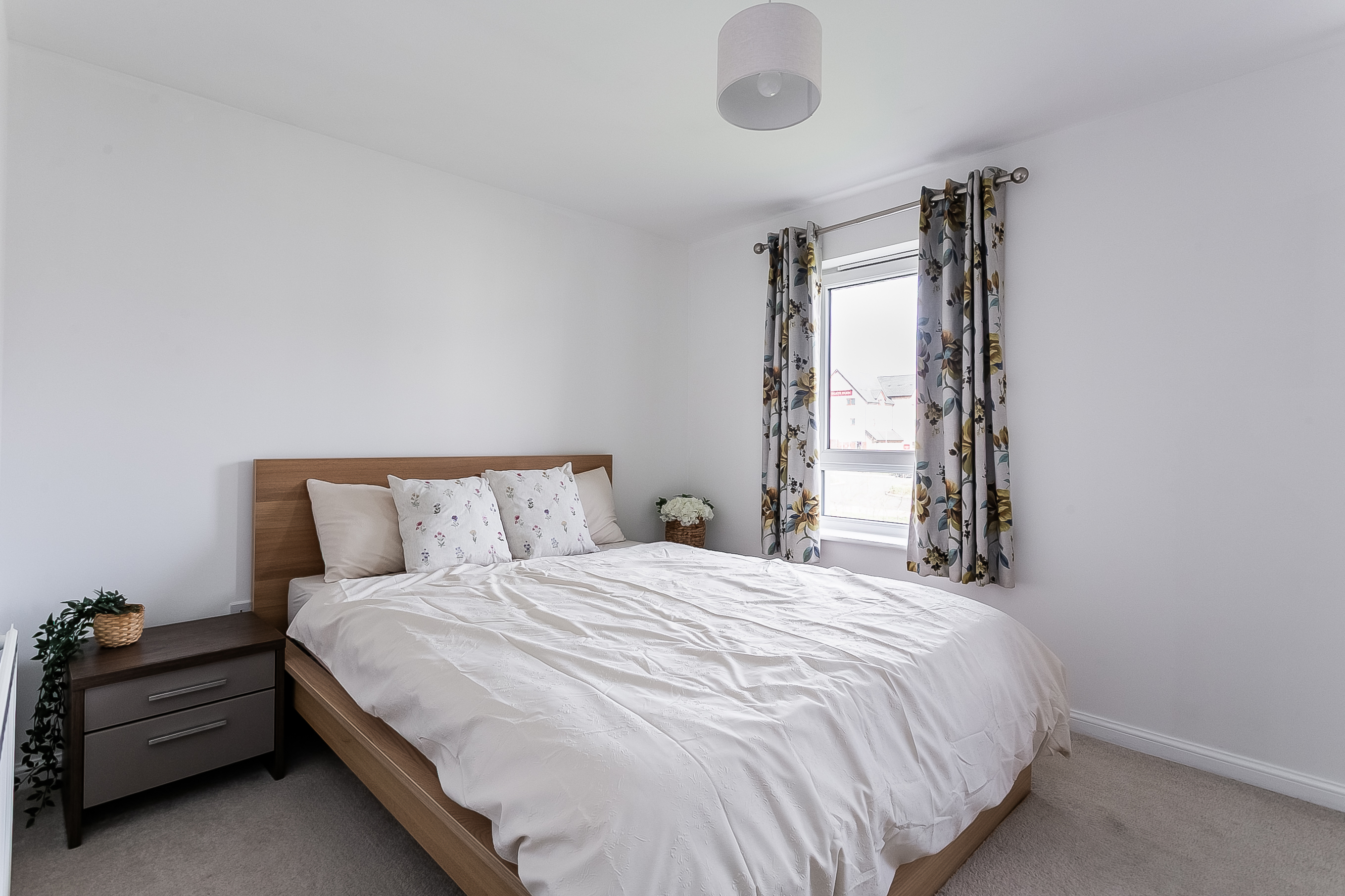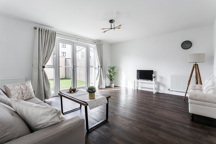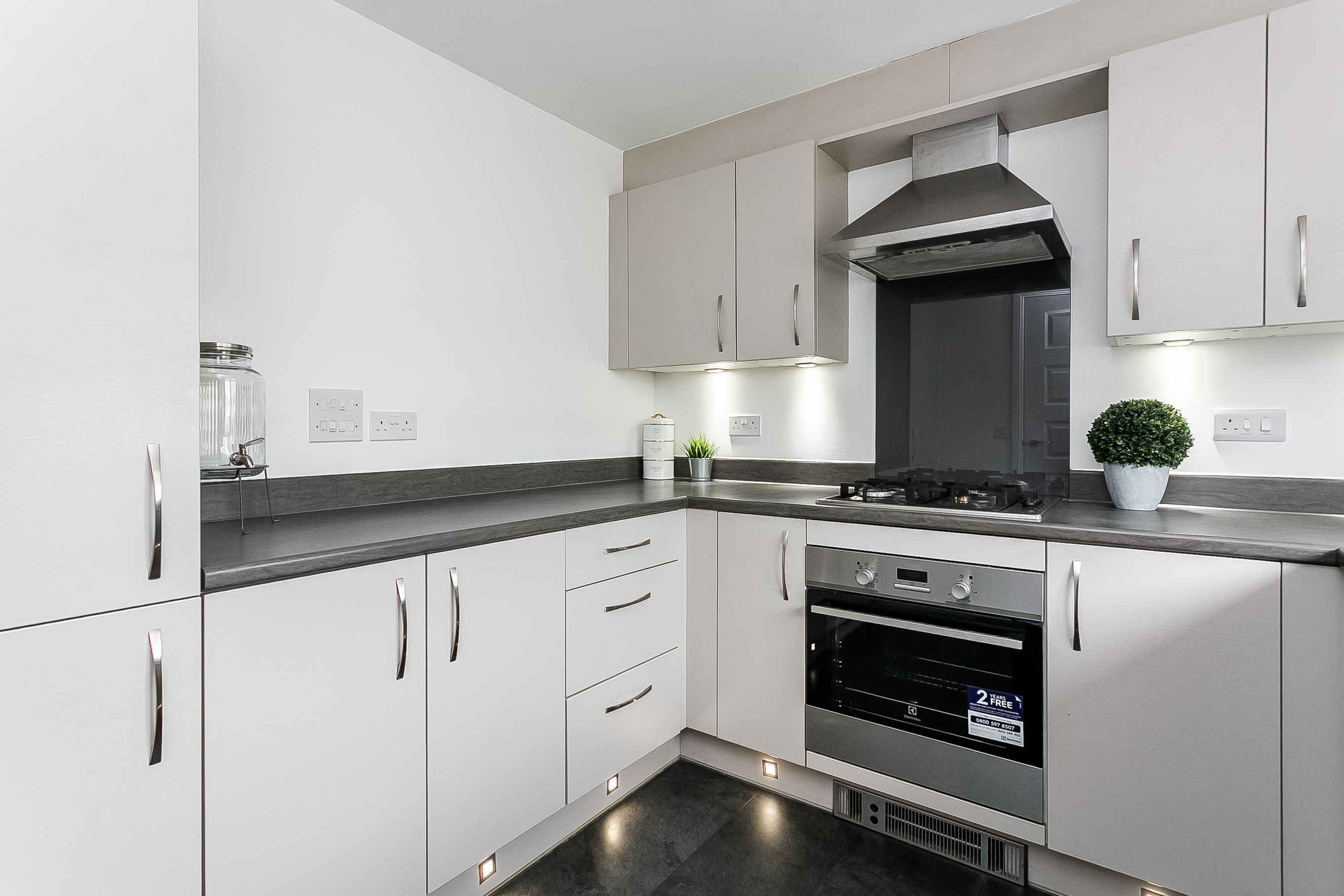 The living room is finished with contemporary flooring and light, tasteful décor throughout, with patio doors providing direct access to the private garden, making this spacious room ideal for entertaining guests. The kitchen has been finished with tiled-effect flooring, granite-effect countertops with matching upstands, a stainless steel sink with drainer, as well as an integrated oven and gas hob with canopy above, and includes a dishwasher and a fridge/freezer.