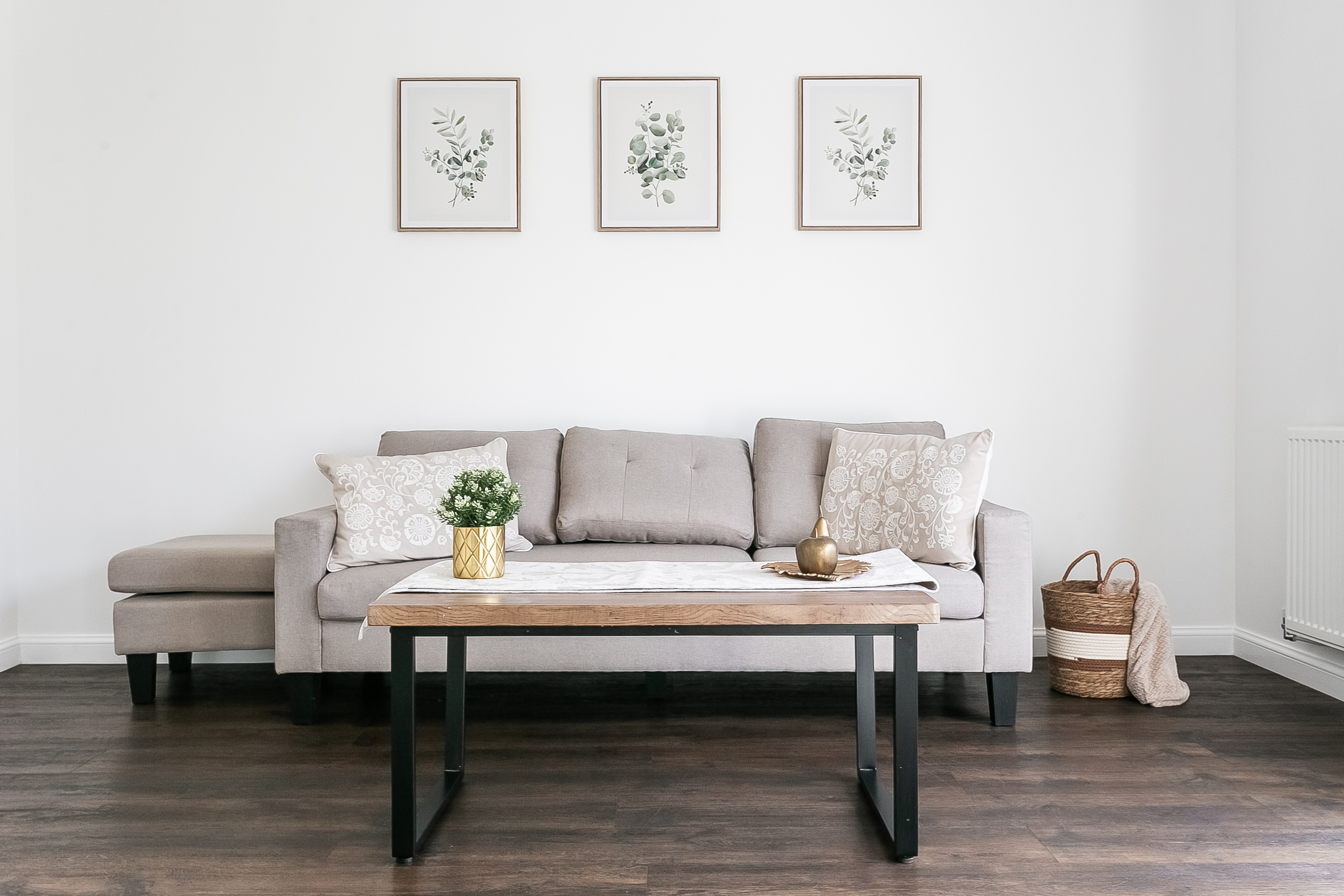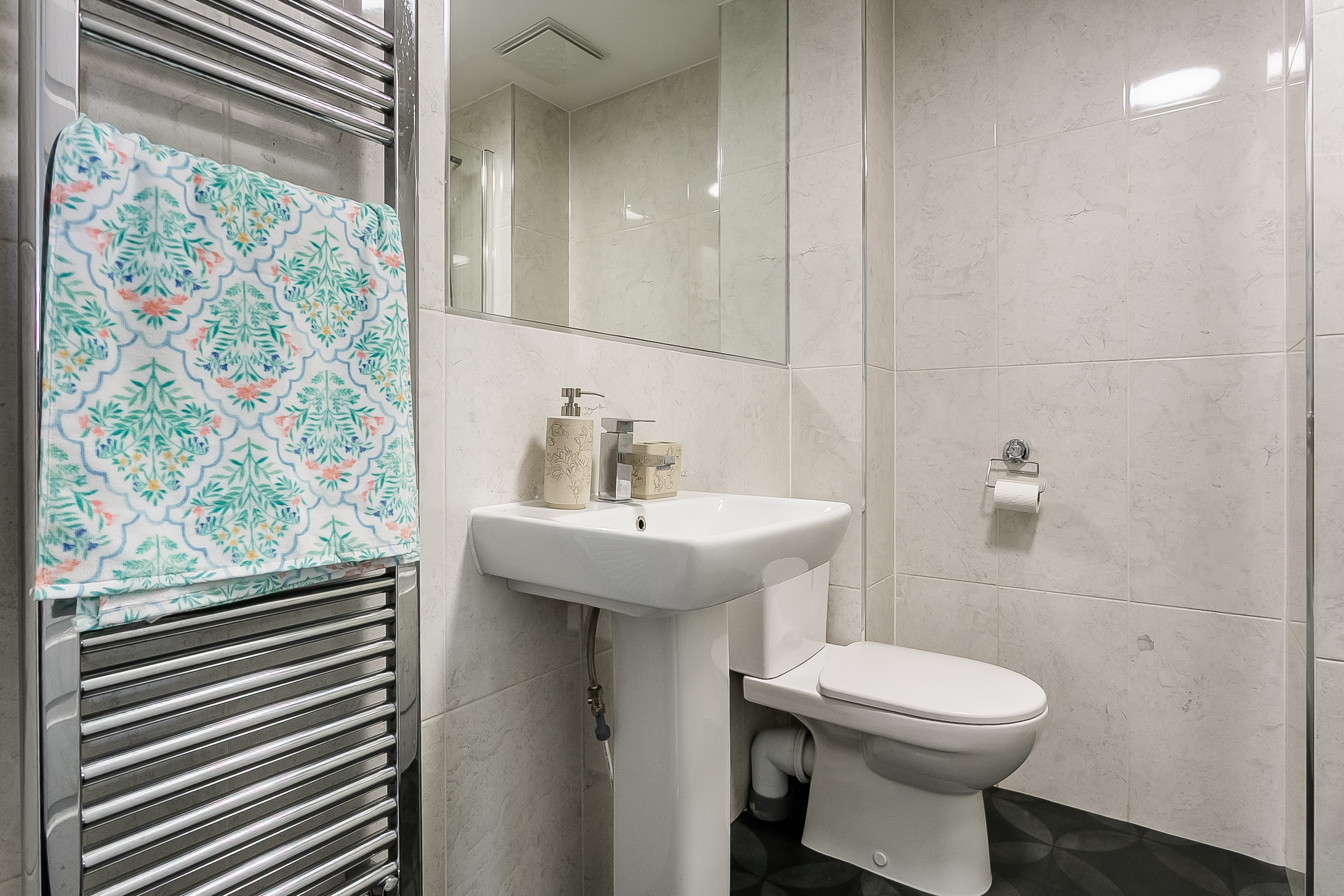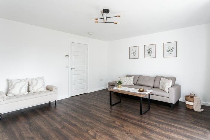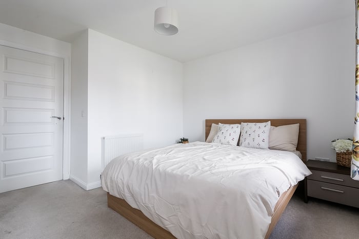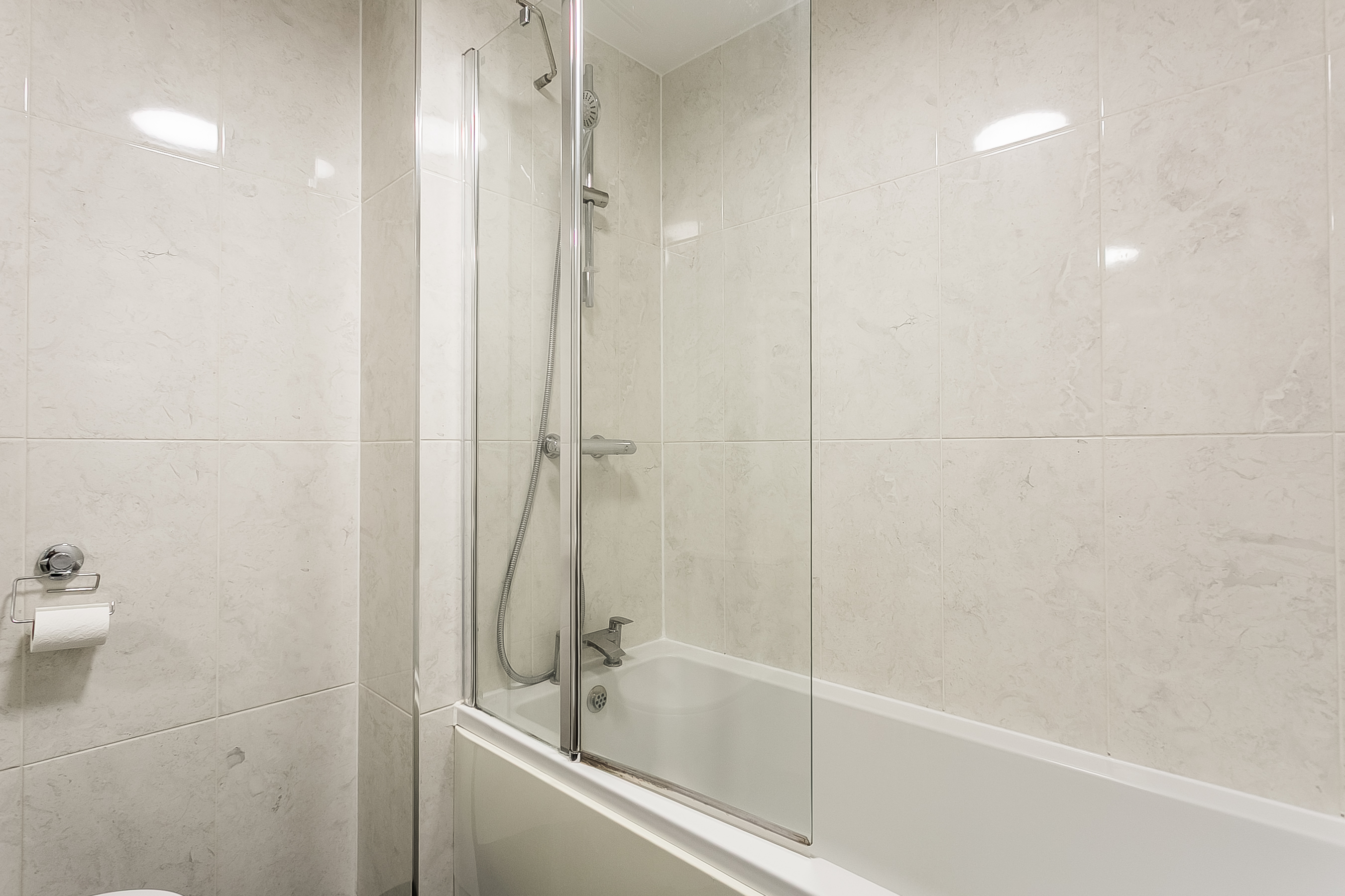 The living room is finished with contemporary flooring and light, tasteful décor throughout, with patio doors providing direct access to the private garden, making this spacious room ideal for entertaining guests. The kitchen has been finished with tiled-effect flooring, granite-effect countertops with matching upstands, a stainless steel sink with drainer, as well as an integrated oven and gas hob with canopy above, and includes a dishwasher and a fridge/freezer.