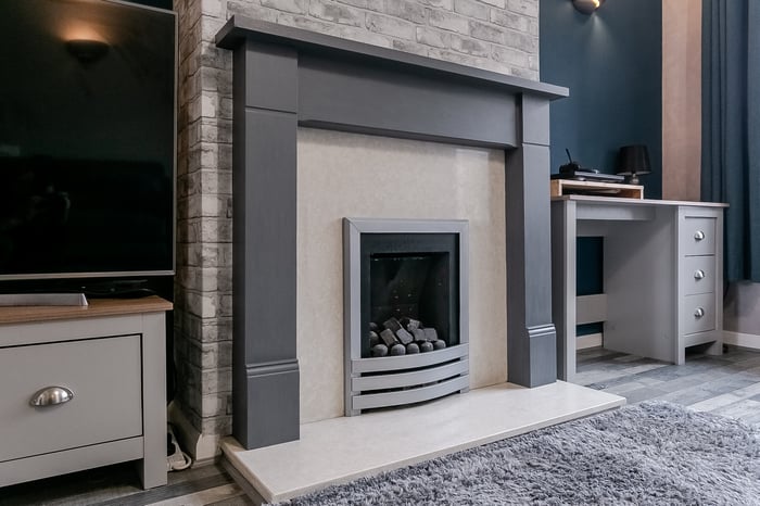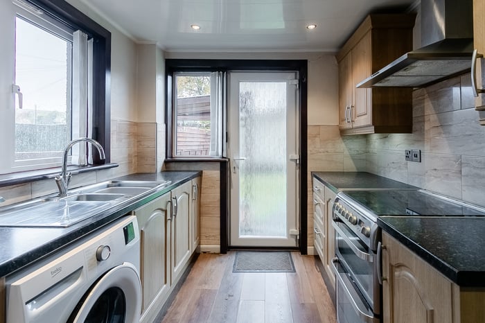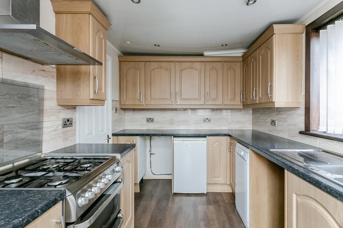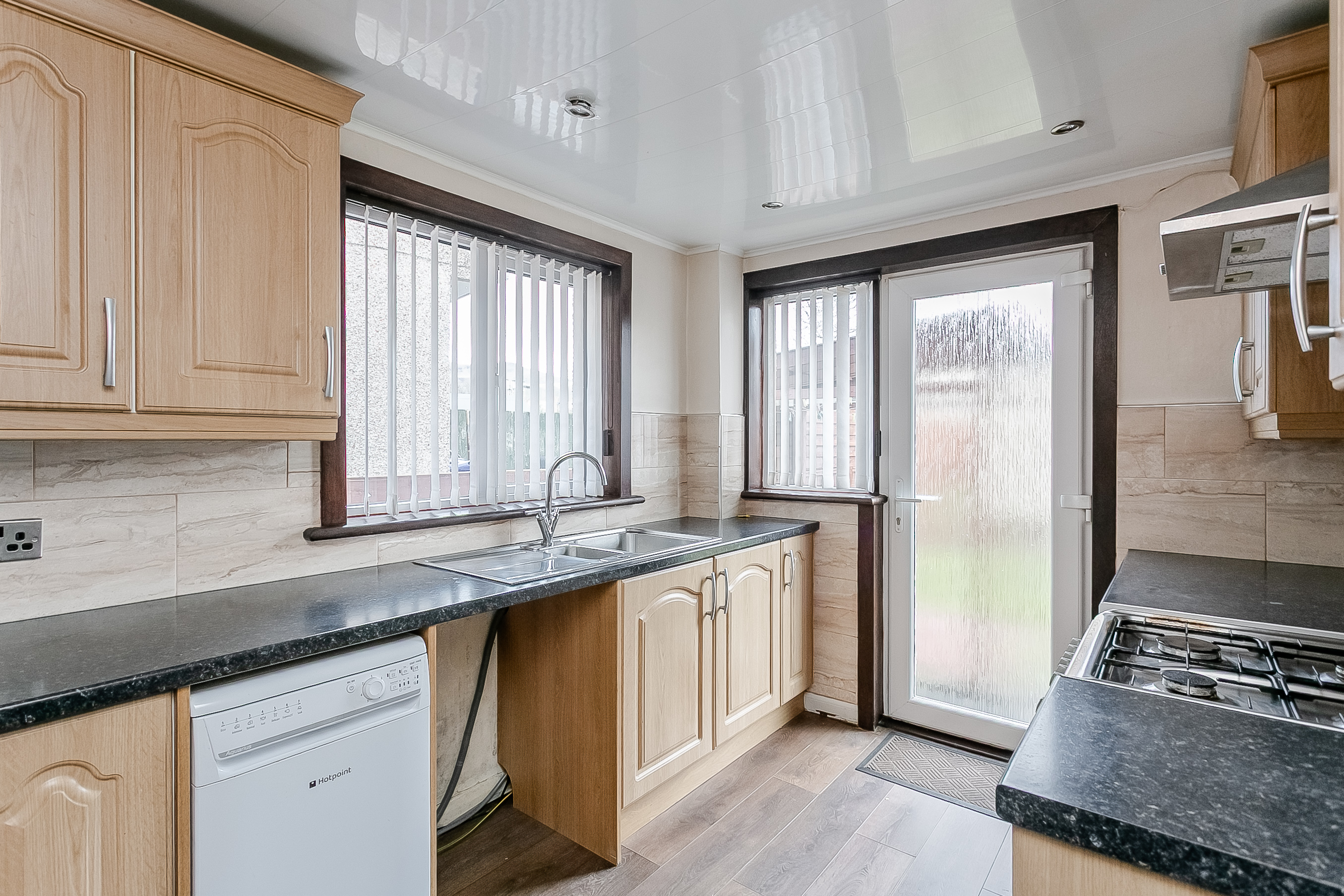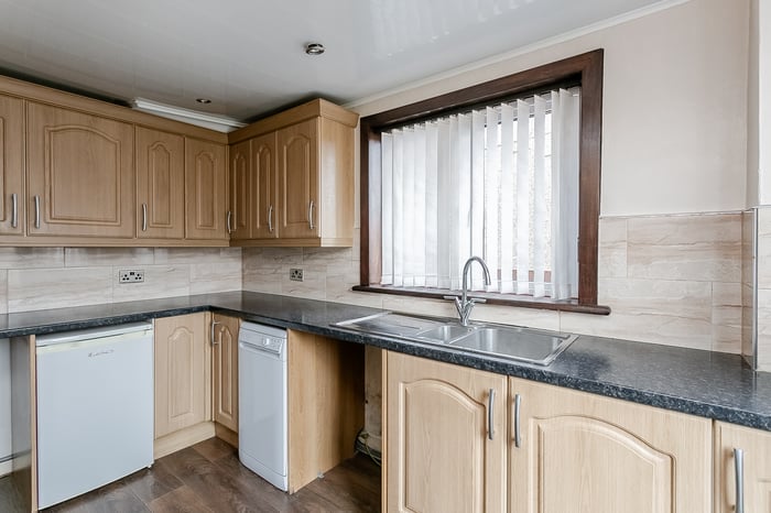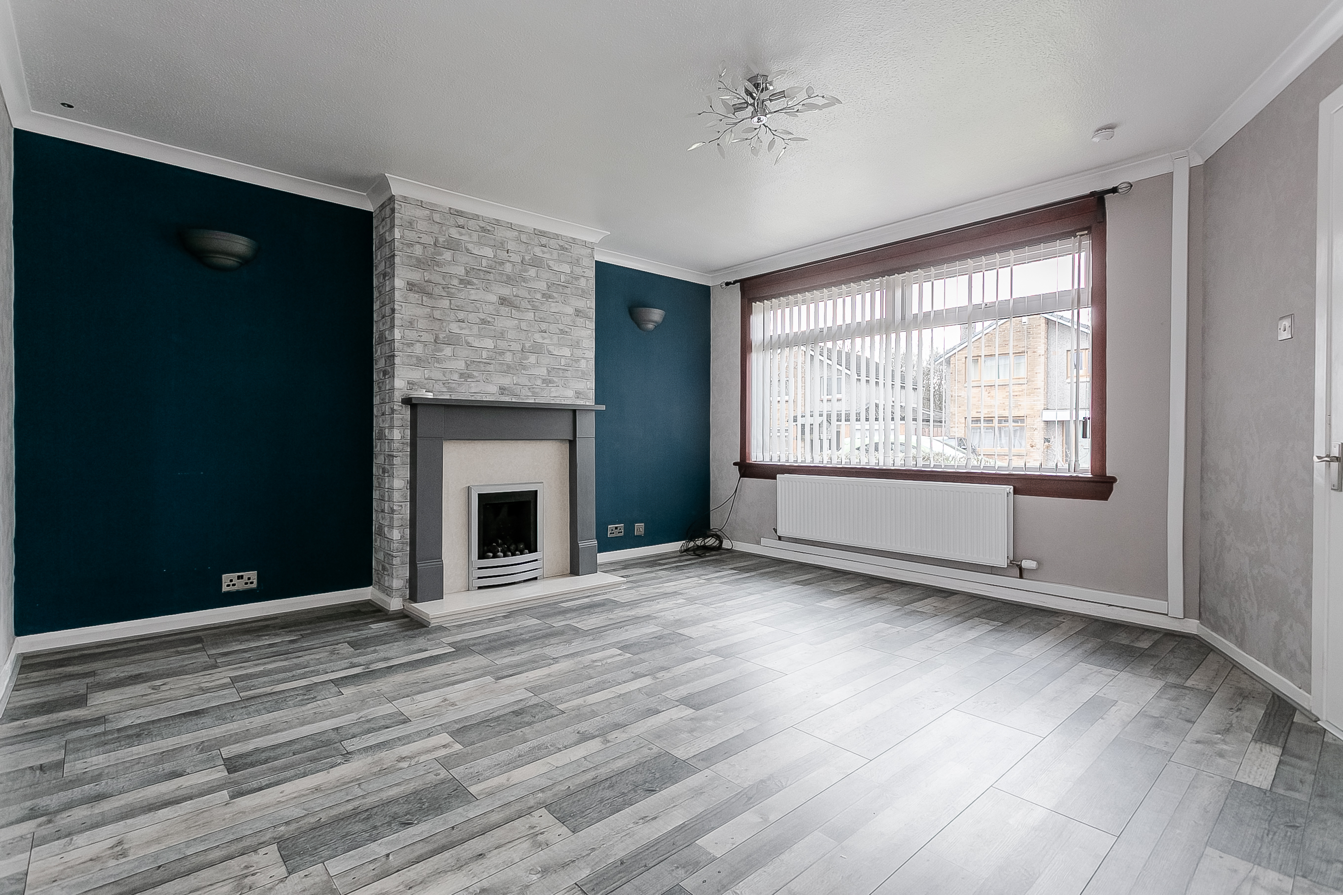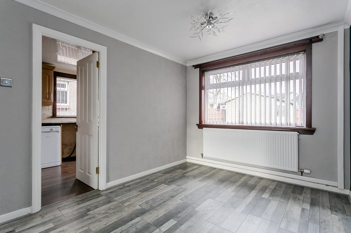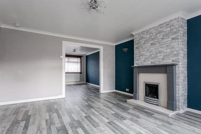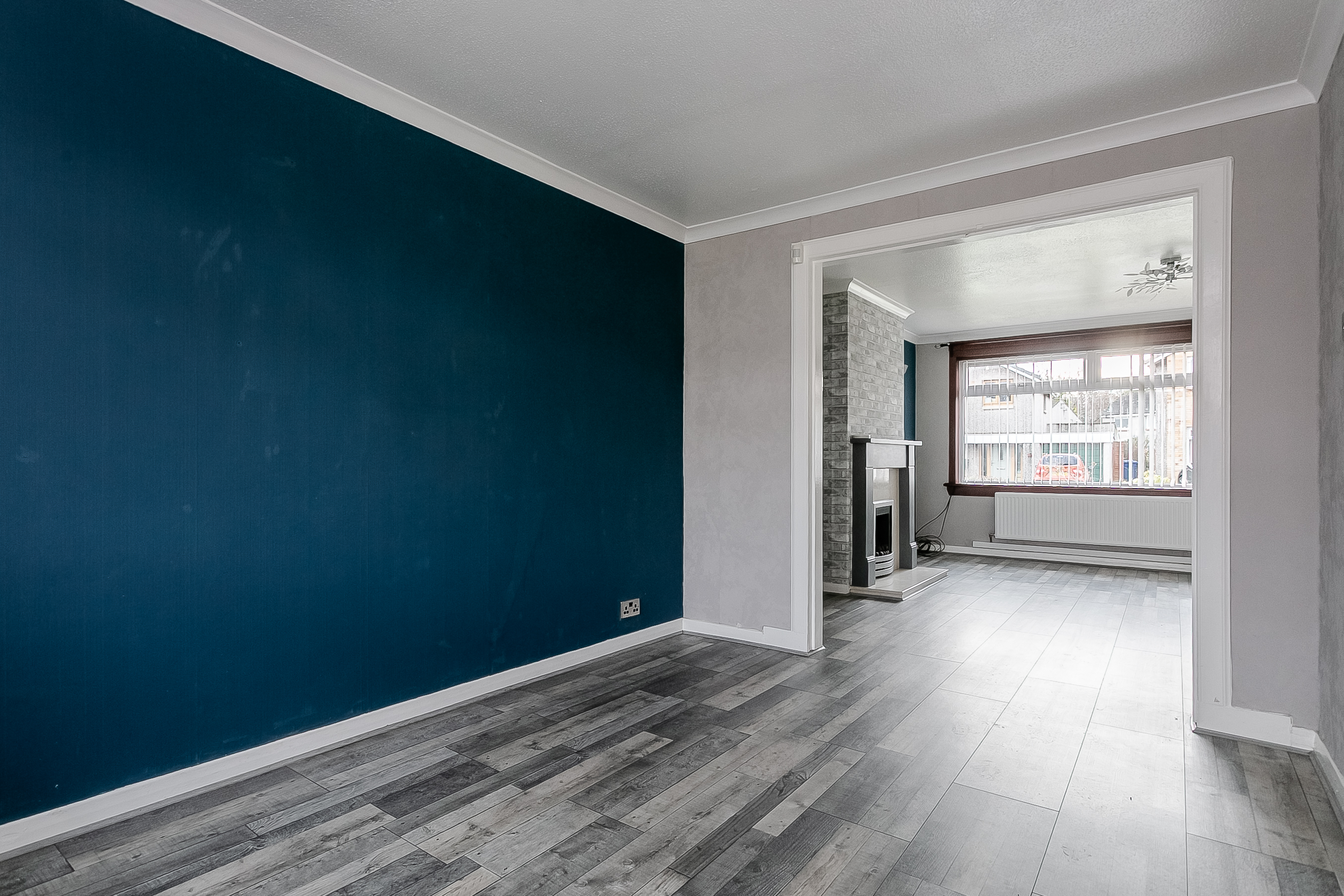 The space is tastefully styled with a feature wall, an electric fireplace, and contemporary wood-effect flooring which flows seamlessly through to the adjoining dining area. Off the dining area, a well-proportioned kitchen is fitted with a range of wall and base units, stone-effect worktops, a stainless-steel sink with drainer, and a stylish splashback surround.