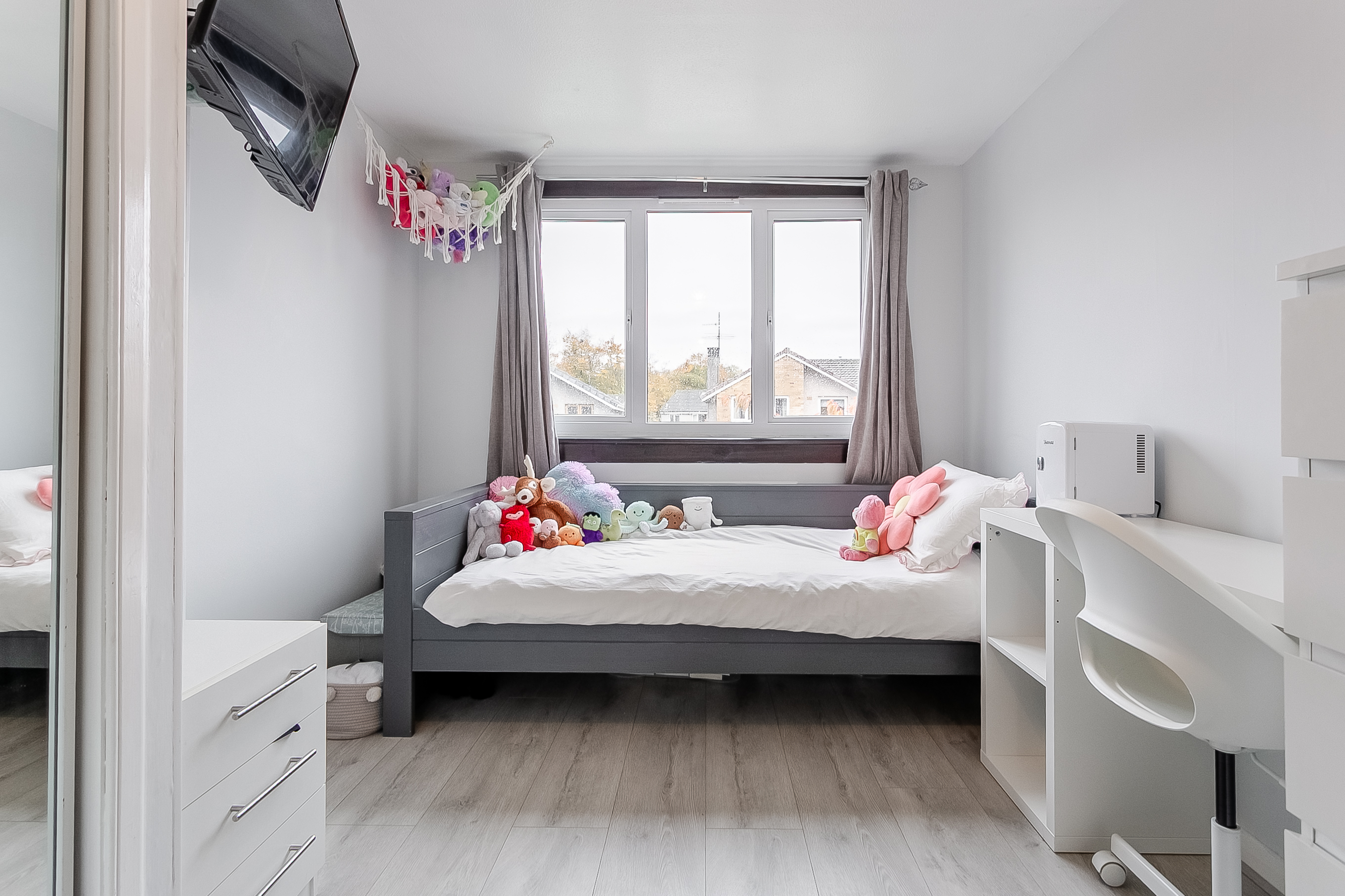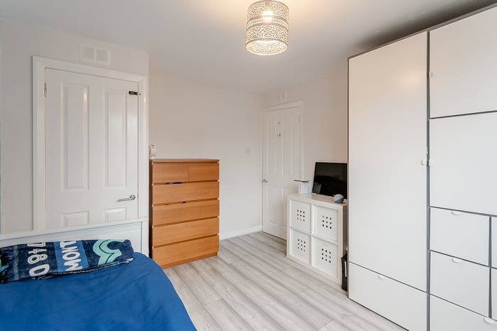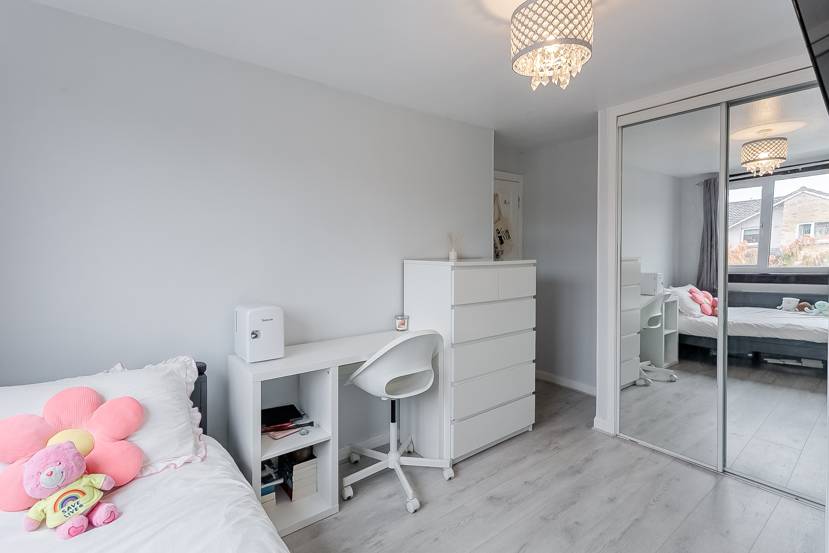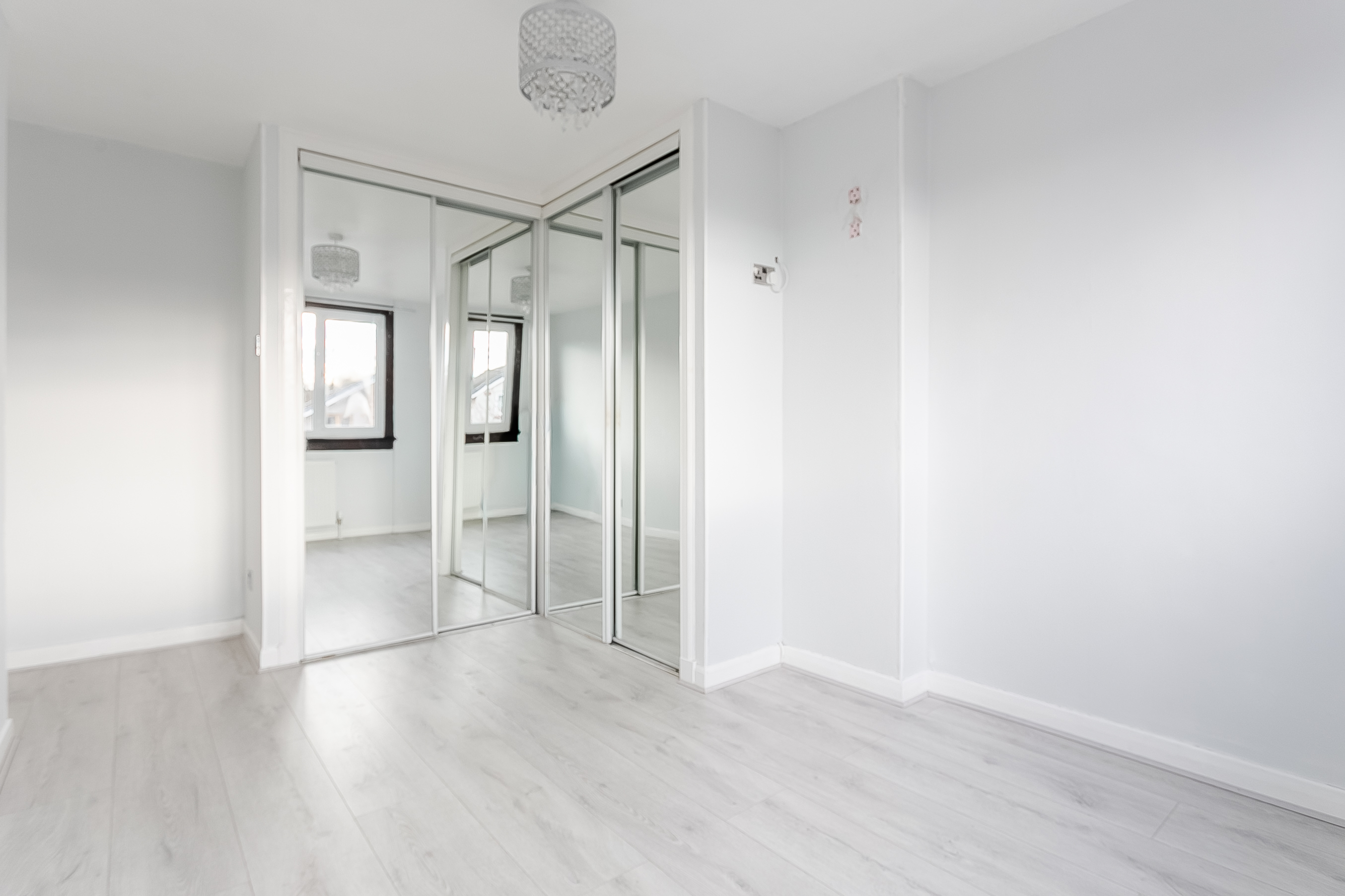Upstairs, the property offers three further bedrooms, all finished with wood-effect flooring. The principal bedroom benefits from two mirrored fitted wardrobes, while the second bedroom is similarly well-sized and includes a built-in cupboard, providing excellent storage options.
