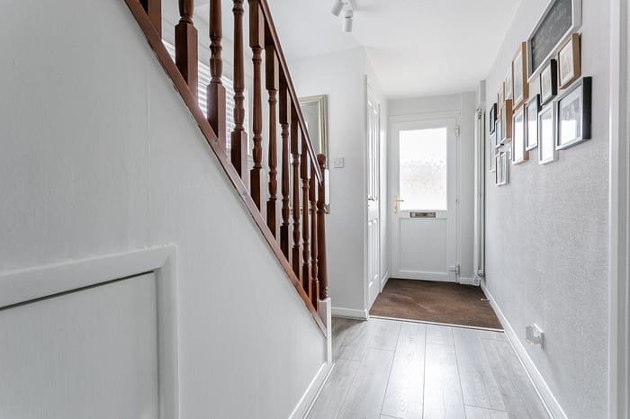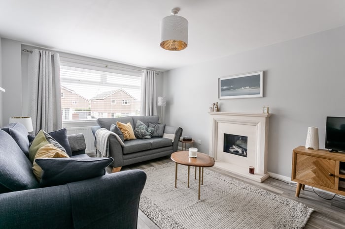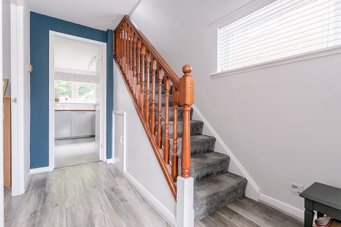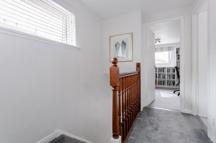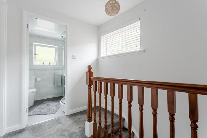 Light and beautifully presented, a three-bedroom detached family home with immaculate gardens, a driveway, a detached garage and mature woodland adjacent to the rear, located in the popular residential area of Currie, south-west of Edinburgh city centre. You’re welcomed into the home through a bright entrance that leads into the kitchen, dining, and living area, and there is a fully tiled downstairs WC.