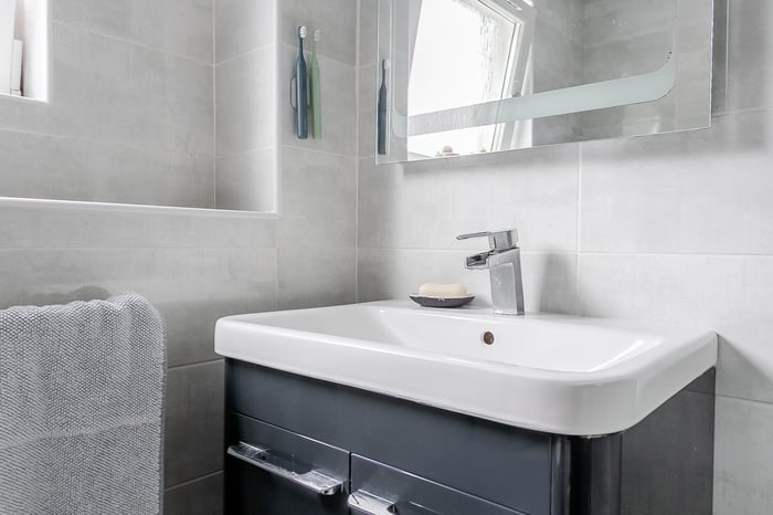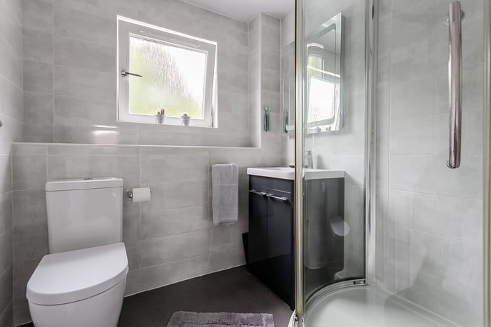 A fully tiled three-piece shower room with a shower cubicle completes the property.