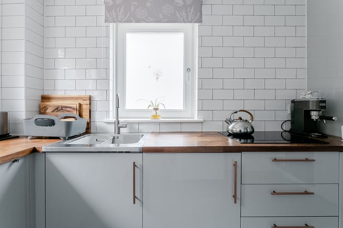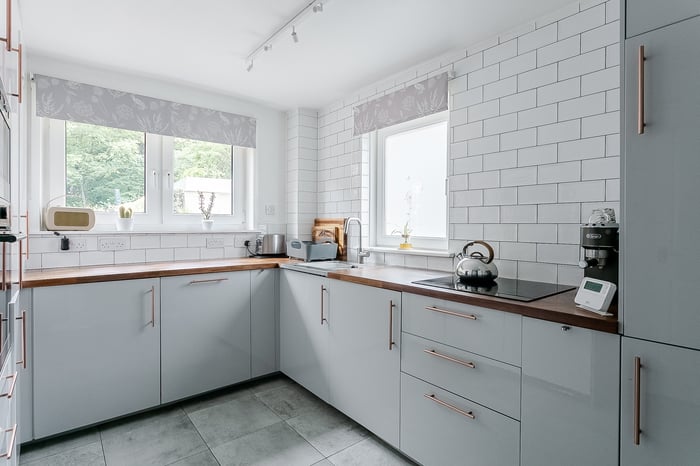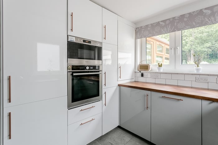 The kitchen has a modern look with tiled flooring, wood-veneer worktops, contemporary tiles, and built-in appliances including an oven, microwave, induction hob, washing machine, dishwasher, and fridge/freezer. Upstairs offers three double bedrooms, all carpeted and with neutral décor, with bedrooms one and two including built-in storage.