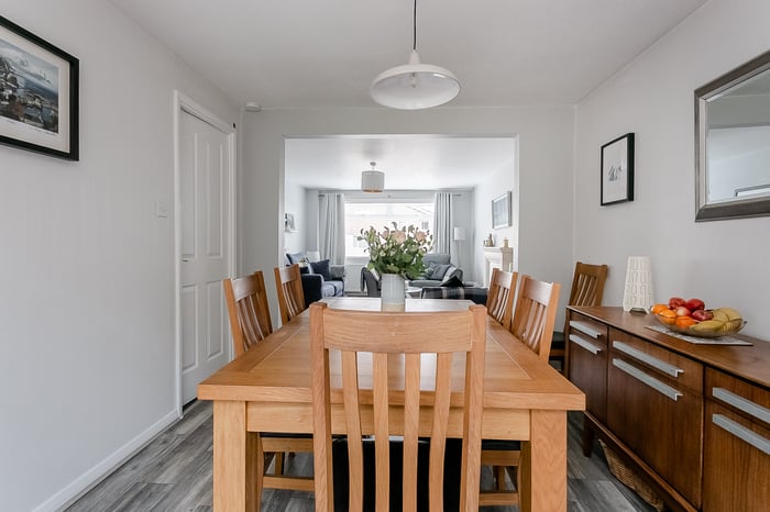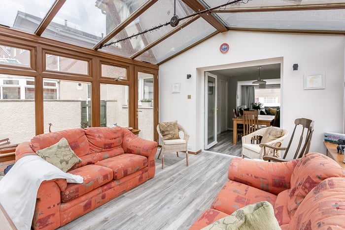 The hall, living, dining and conservatory feature quality laminate flooring throughout. The living and dining room has light décor, a modern fireplace, with a dining room at the rear and access to a conservatory overlooking the garden.