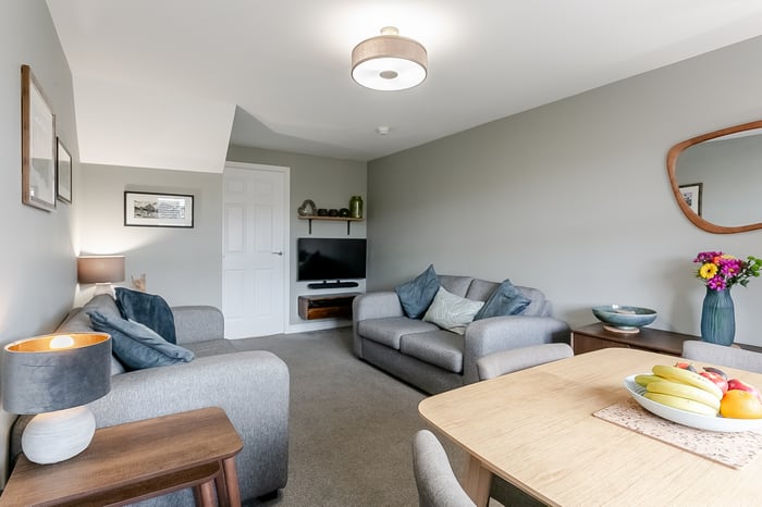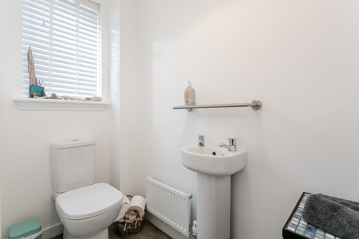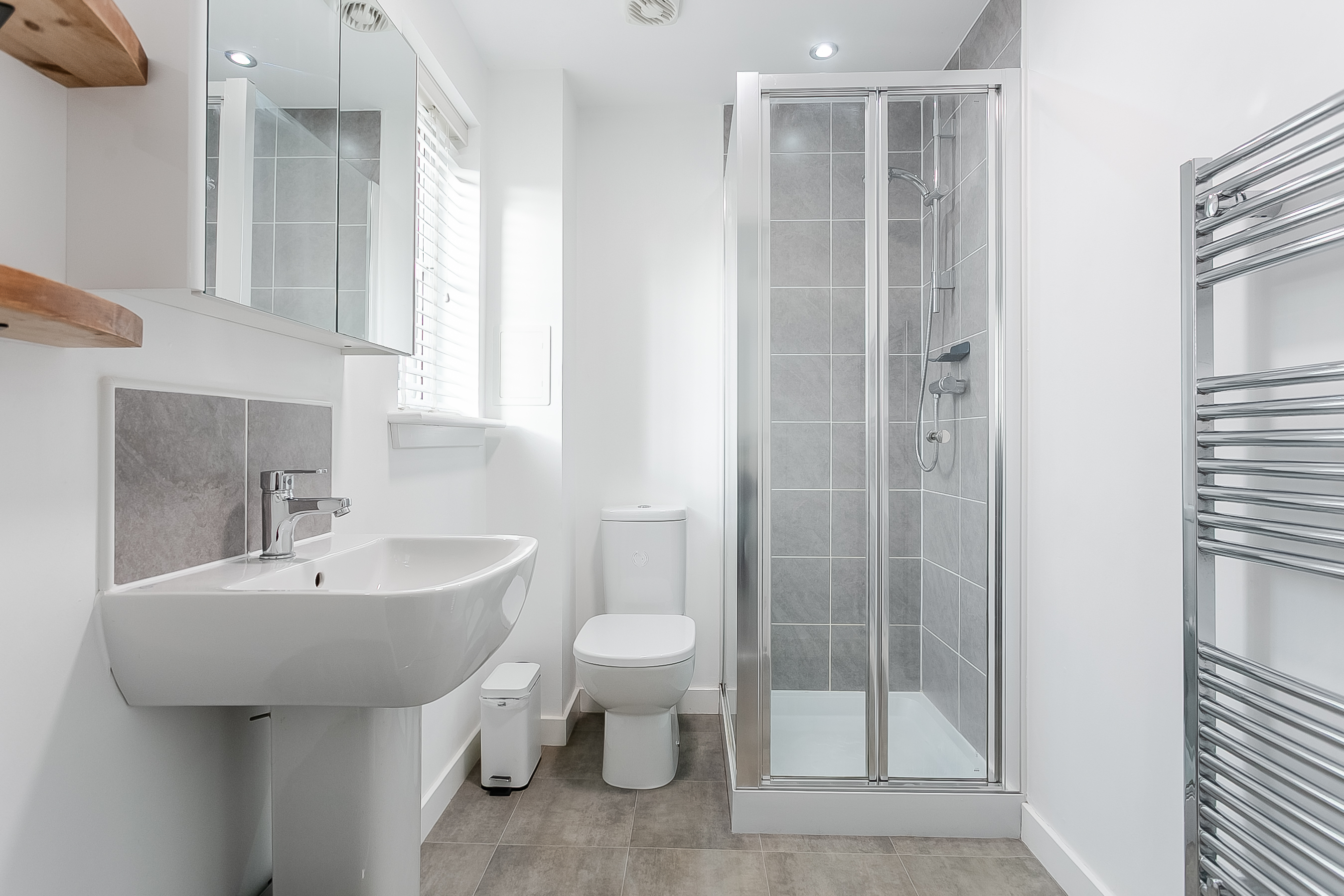 Completing the accommodation, the modern family bathroom includes a three-piece suite with a shower-over-bath, tiled splash walls and a ladder-style radiator.