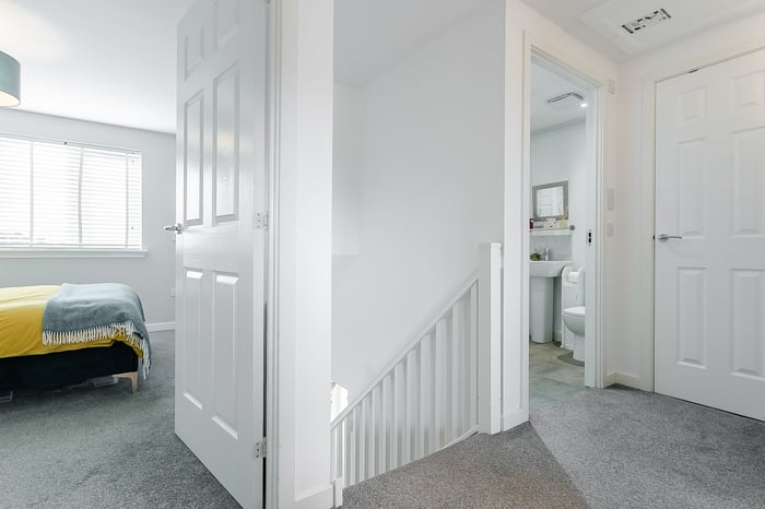 Upstairs, the exceptionally spacious master bedroom is positioned to the front and benefits from excellent storage, including a built-in wardrobe and cupboard, as well as a stylish en-suite shower room. Two further well-proportioned bedrooms are set to the rear, both finished in light, neutral décor and carpeted for comfort — with bedroom two also featuring a built-in wardrobe.