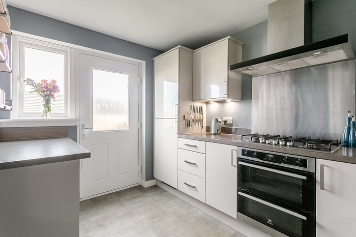 Styled in neutral tones with fitted carpeting, this generous space features a built-in storage cupboard, TV point, and ample room for a dining area. Set off the lounge, the contemporary kitchen enjoys direct access to the rear garden and is fitted with modern cabinetry, stone-effect worktops with matching upstands, and an integrated hob, oven, fridge/freezer and dishwasher — ideal for modern family living.