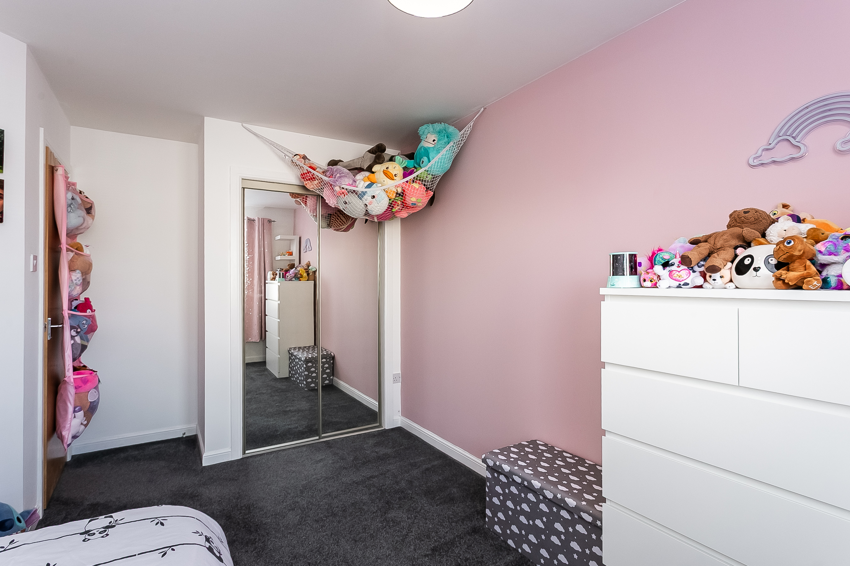 Upstairs, the property offers two well-proportioned double bedrooms, both finished with carpeted flooring and featuring built-in wardrobes, along with generous space for additional freestanding furniture. Completing the accommodation, the stylish shower room features a large shower cubicle with a rainfall showerhead, modern panelled splash walls, a ladder-style radiator, and contemporary marble-effect flooring.