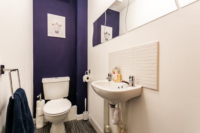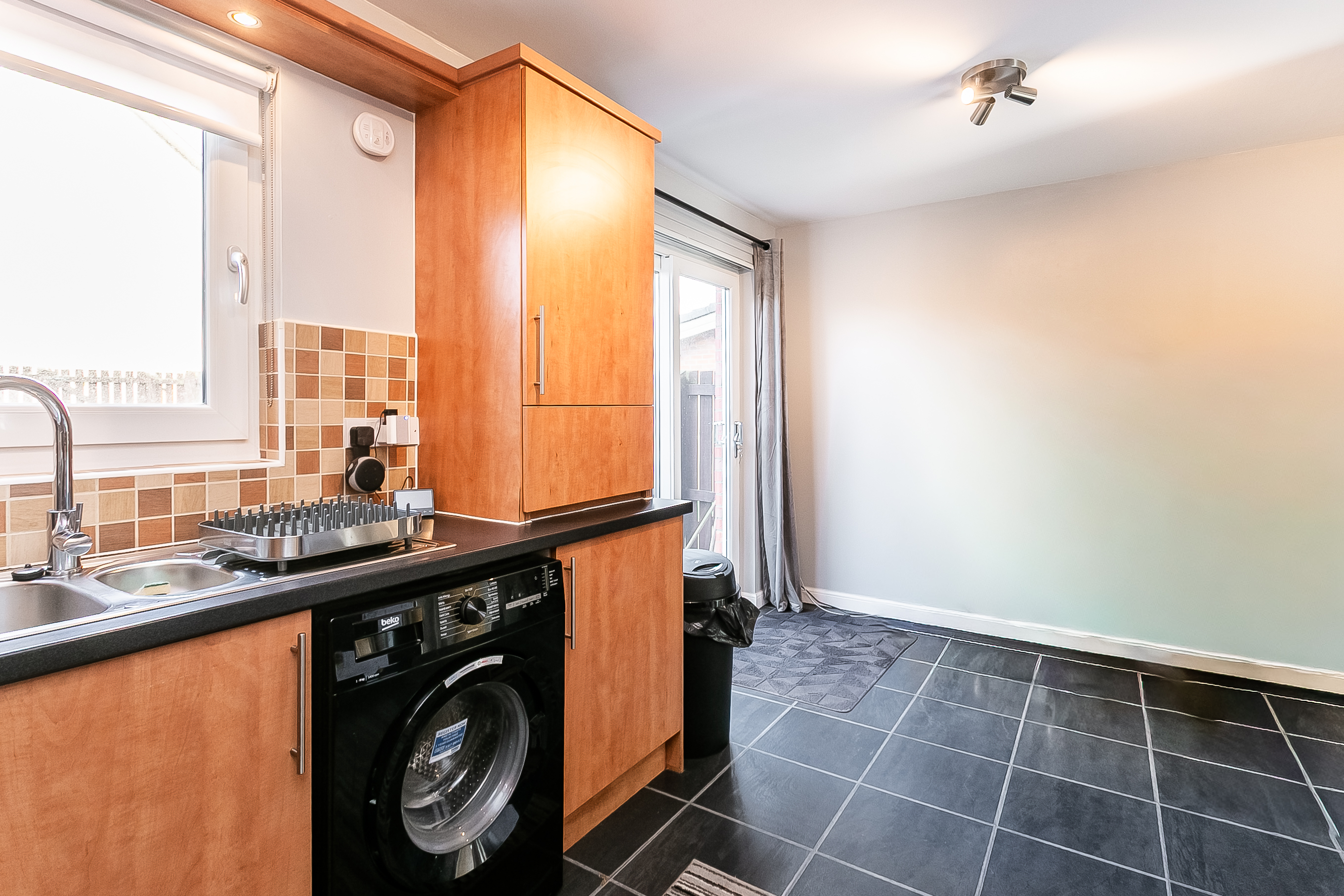 Positioned just off the lounge, the contemporary kitchen is fitted with modern units and complementary worktops, incorporating a sink with drainer and spray-pull tap, tiled surrounds, and an integrated hob and oven. There is ample space for dining, while patio doors open directly onto the rear garden, offering an ideal layout for entertaining and indoor-outdoor living. A convenient WC set between the lounge and kitchen completes the ground floor.