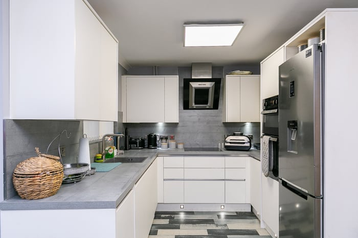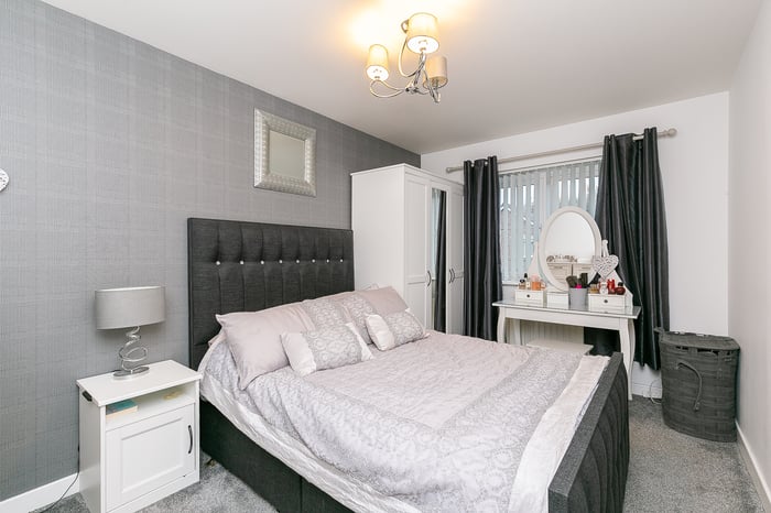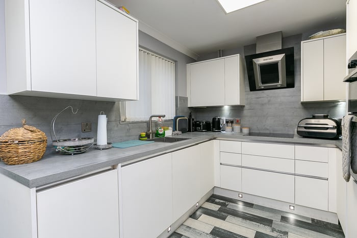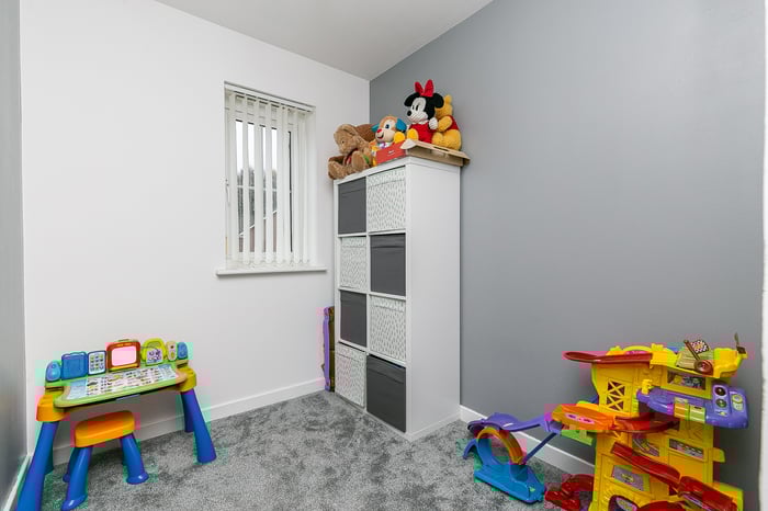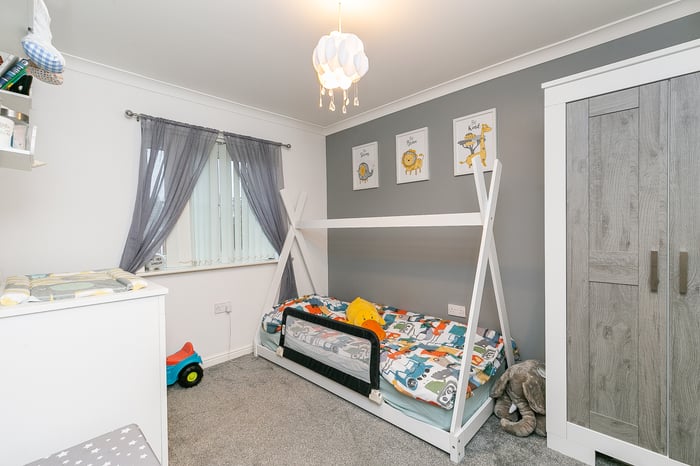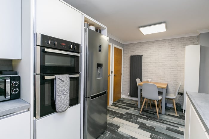 Appliances include an integrated double oven, an electric hob with a canopy above, a washing machine, a dishwasher; and a freestanding fridge/freezer. On the upper floor, bedrooms one and two are similarly well-sized and finished, with carpeted flooring and ample space for freestanding furniture; whilst a further flexible bedroom is set to the front.