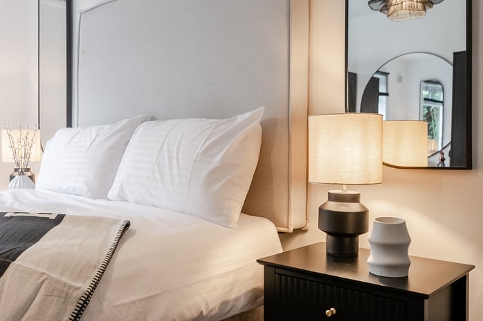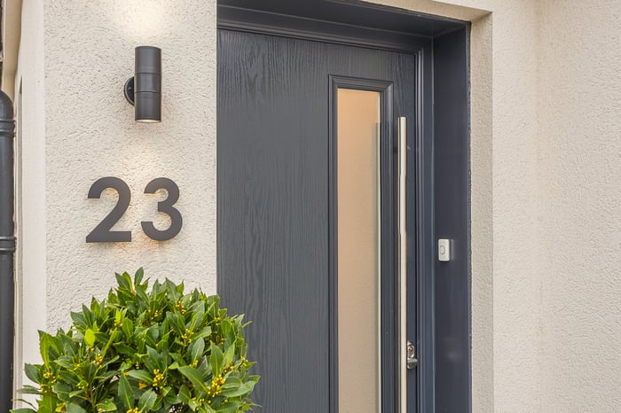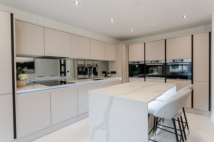 Bathed in natural light from a sunny south-westerly corner aspect, this elegant space features sleek porcelain floor tiles, contemporary spotlighting, and a TV point for the lounge area. The high-spec kitchen is designed for both style and functionality, complete with chic modern units, luxurious marble worktops, a central island with a breakfast bar and Quartz waterfall worktops, a sink with a Quooker tap, and a full range of integrated appliances – including an induction hob, eye-level double oven, single oven/microwave/grill, built-in coffee machine, dishwasher, fridge/freezer and washing machine. The impressive principal bedroom is set to the front of the home and exudes comfort and style, with light decor, plush carpeting, a pendant light, and a TV point, along with ample space for freestanding furnishings.