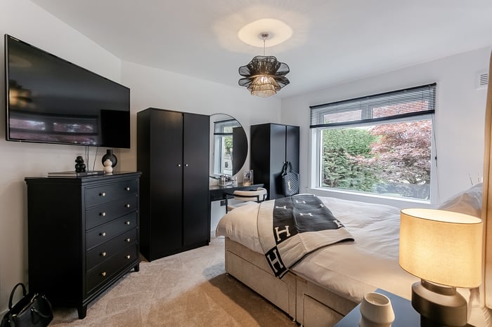 Two additional well-sized bedrooms are positioned at opposite aspects, both immaculately finished with matching decor and carpeting. A stylish family bathroom completes this stunning home, with a luxury three-piece suite, including a rainfall shower over the bath, tiled splash walls and flooring, and a ladder-style radiator.