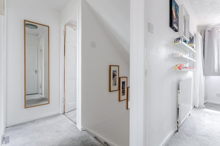 Light and well-presented, three-bedroom, mid-terrace house, with gardens and a double driveway. A welcoming vestibule opens into a bright entrance hall, finished with stylish wood-effect flooring that sets a warm and inviting tone.
