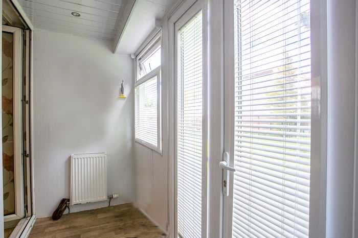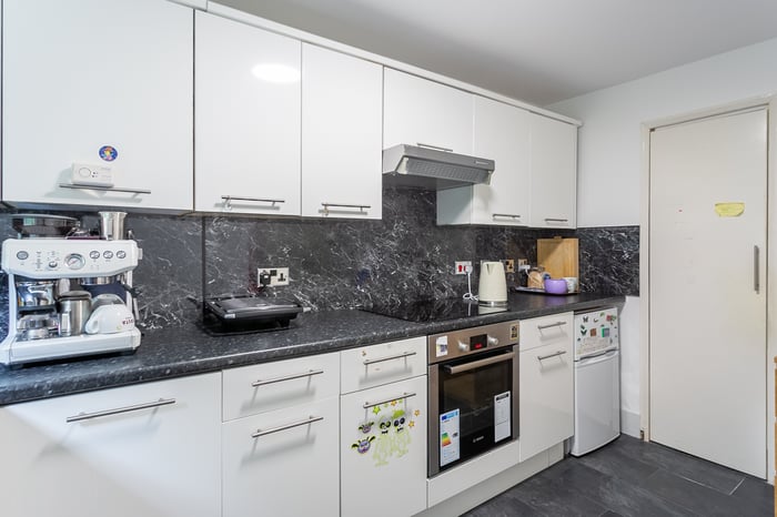 A good-sized, dual-aspect public room offers space for both lounge and dining furniture, and includes modern flooring and a glazed ‘porch’, featuring French doors to the shared gardens. A bright kitchen includes a built-in store and tile-effect flooring, whilst modern fitted units include stone-effect worktops, with a matching surround, a sink with a drainer and an integrated electric oven and hob.