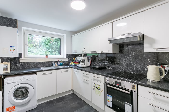 Well-proportioned, two-bedroom, ground-floor flat, forming part of an established development. Conveniently located in the popular Colinton area, south of Edinburgh city centre. An entrance hallway gives access to all rooms except the kitchen, and features built-in storage cupboards, modern wood-effect flooring and two pendant light fittings.