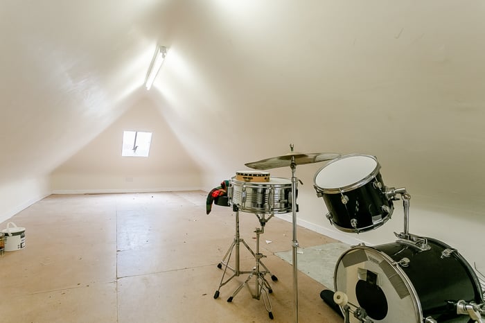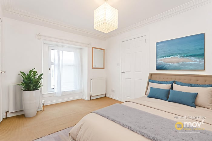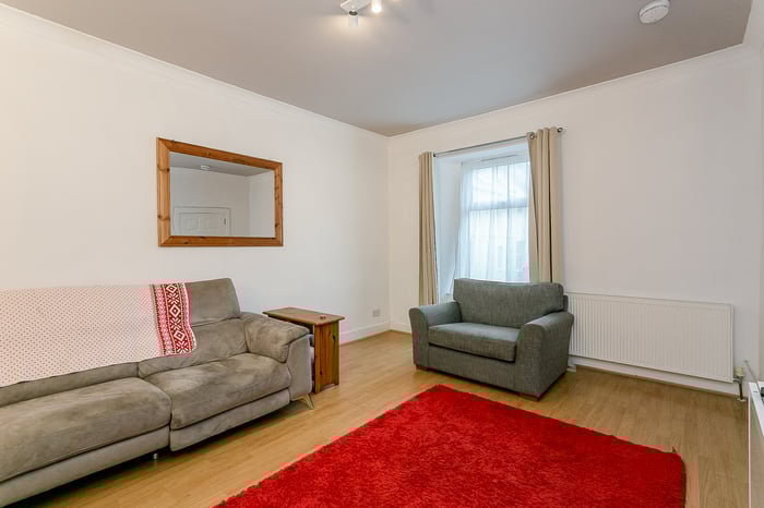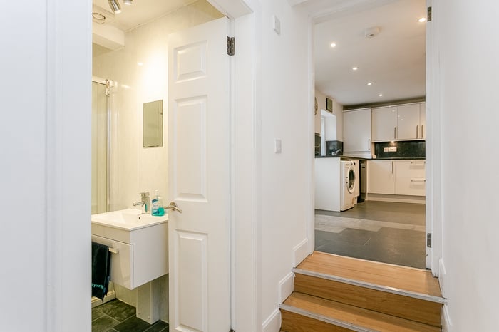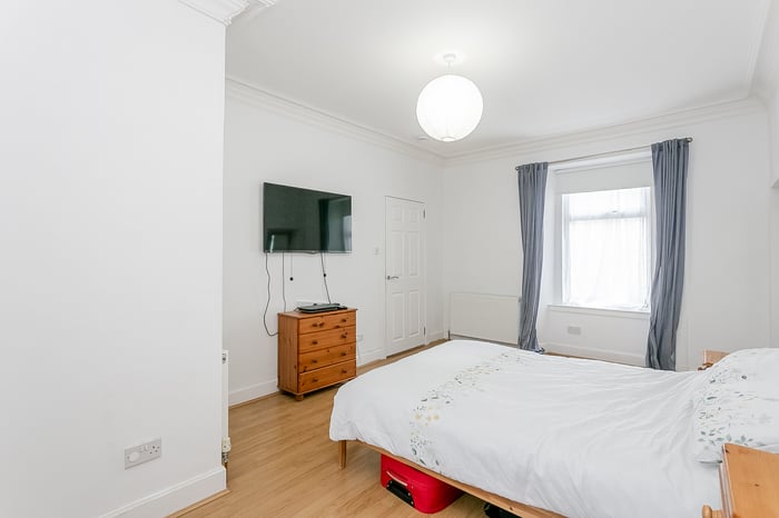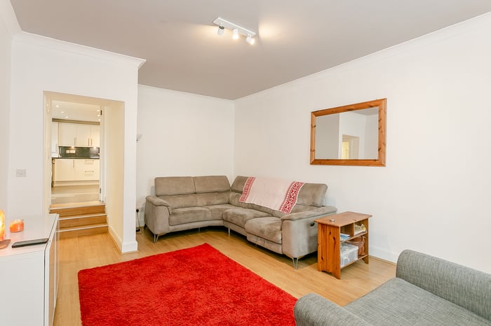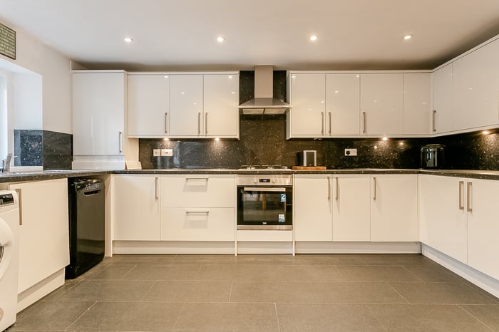 Tiled flooring and spotlighting complete the space, with direct access to the rear garden. The ground floor also features the first of three double bedrooms — a large, dual-aspect room with ample space for freestanding furniture, coving, light decor, and laminate flooring.